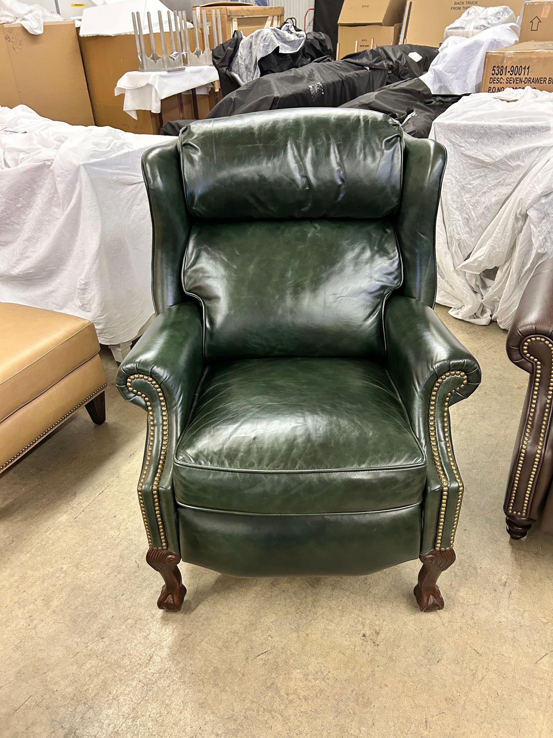 Green leather pushback recliner with nailheads and traditional claw and ball foot