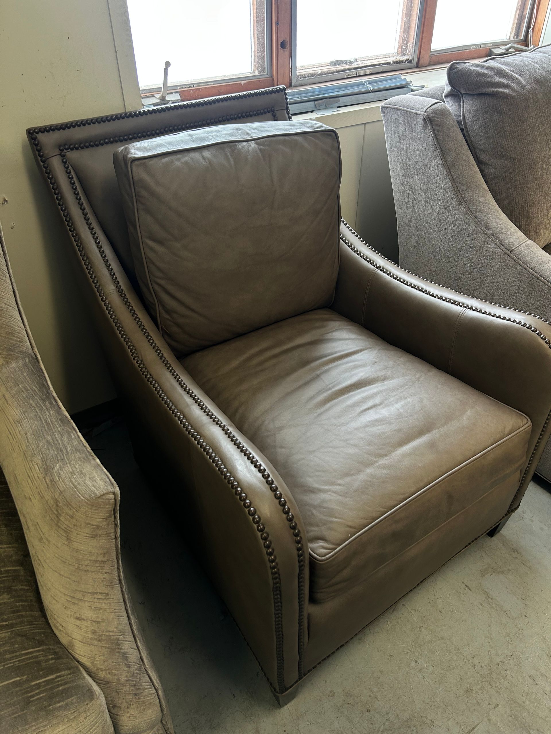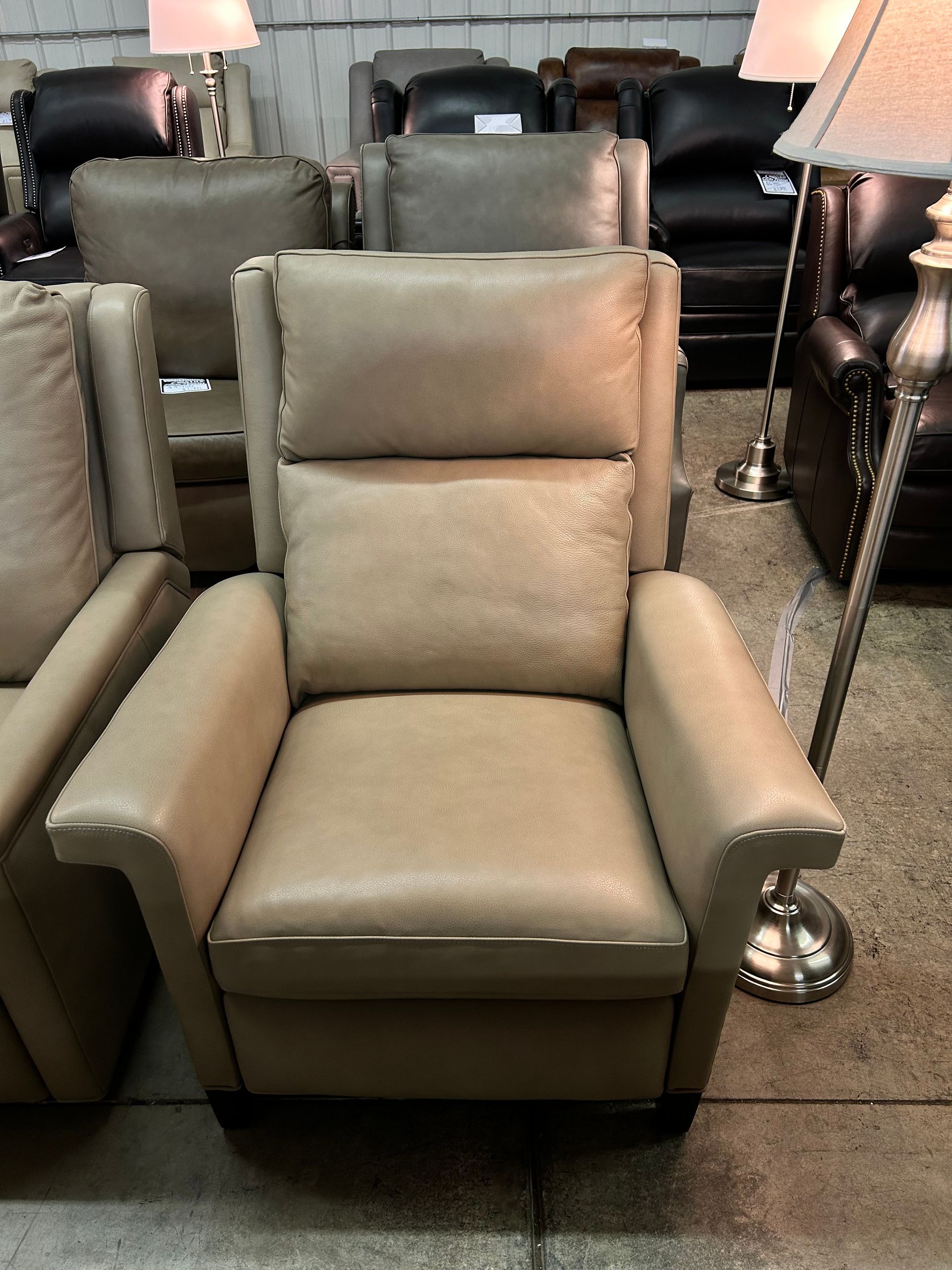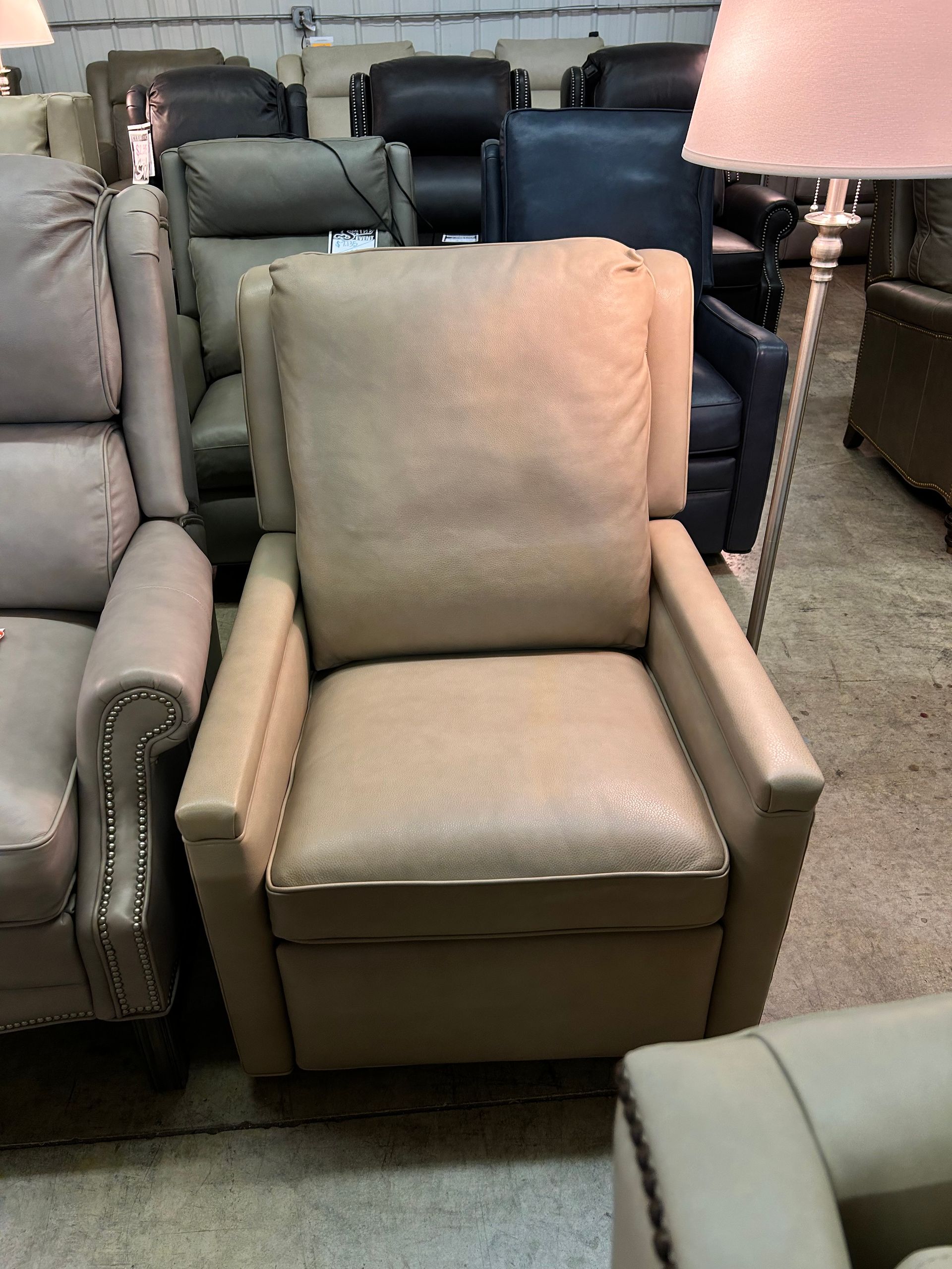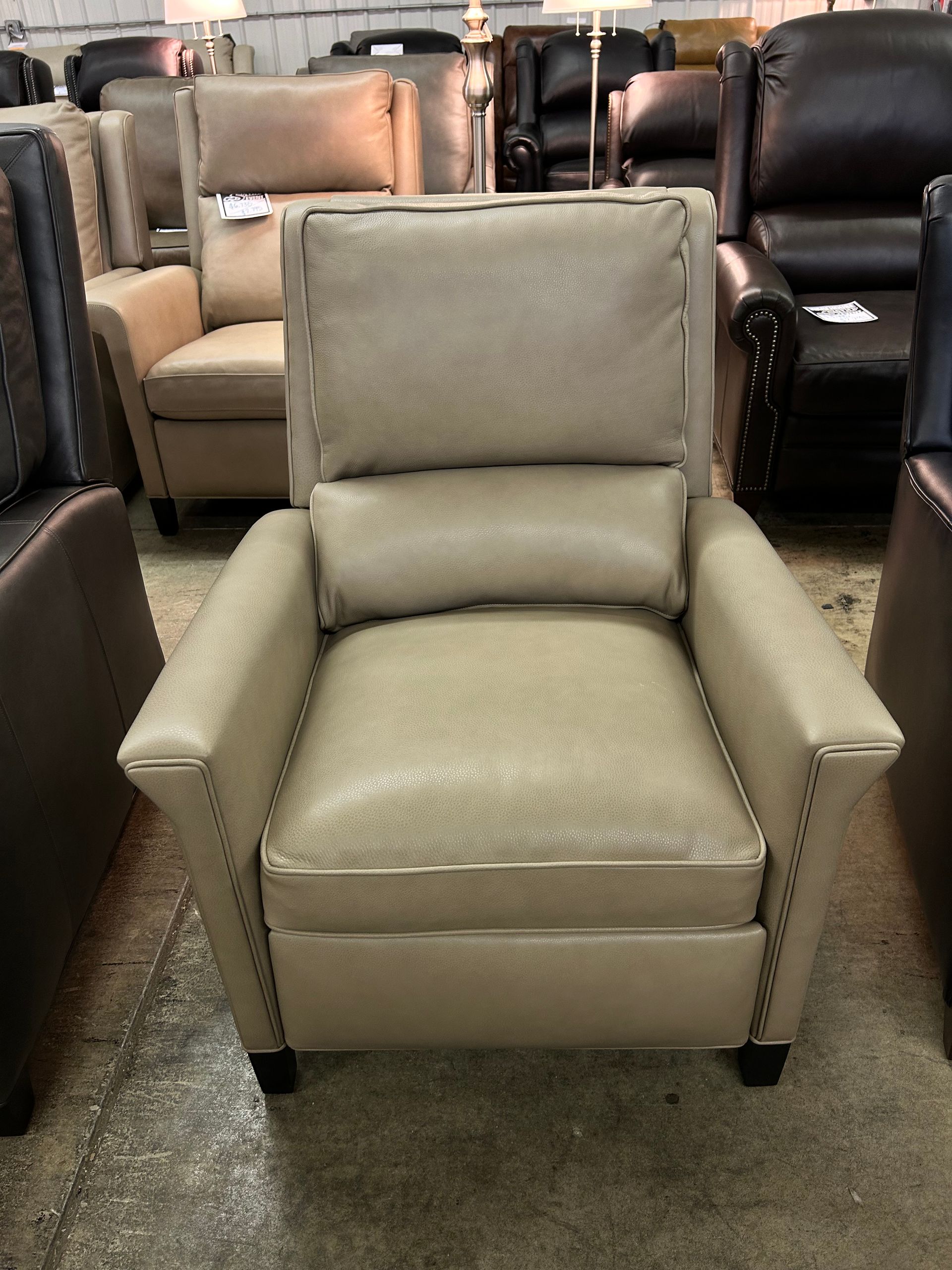 Taupe leather pushback recliner with nailheads