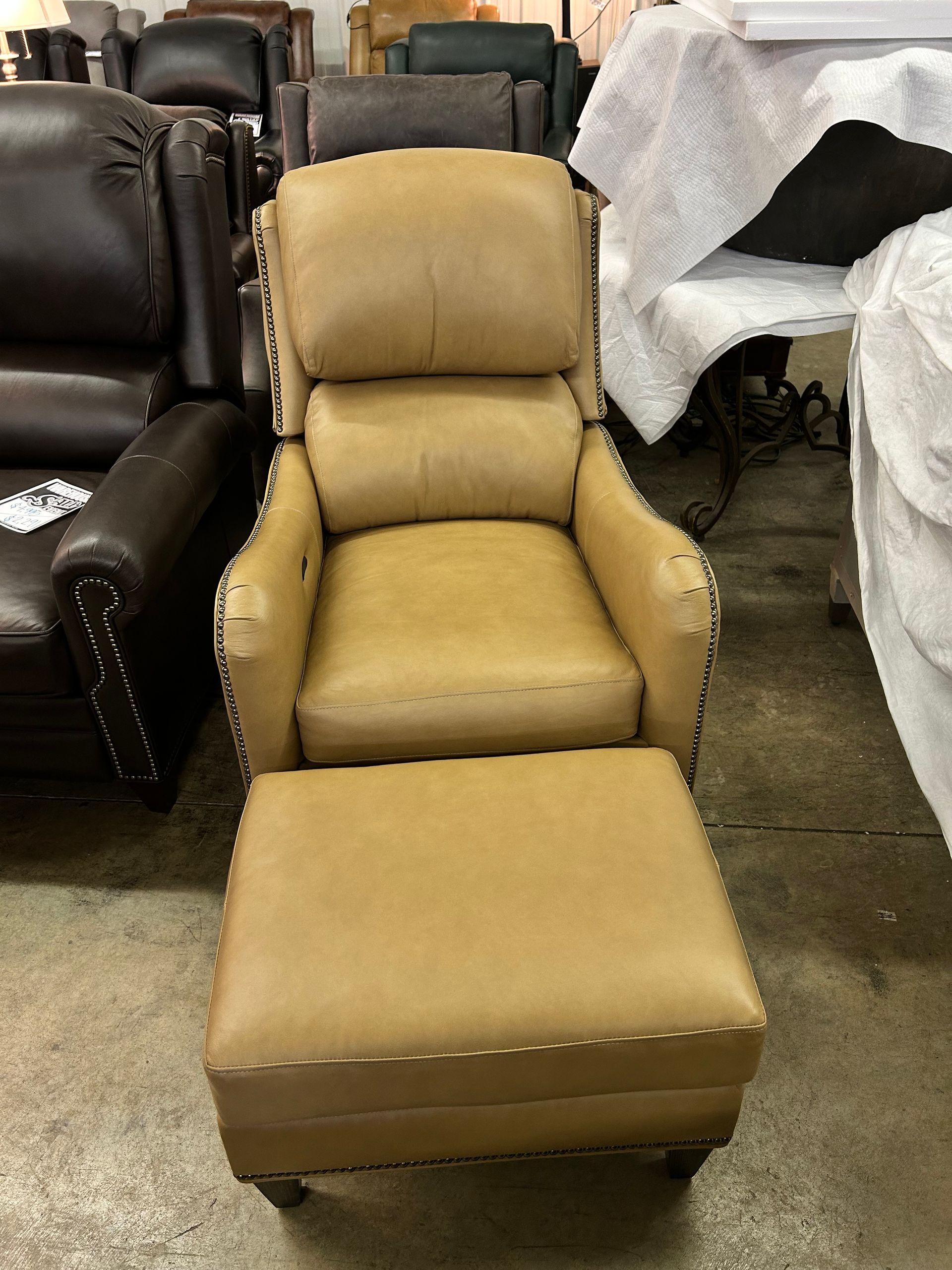Gold leather power tiltback chair with matching ottoman and nailheads