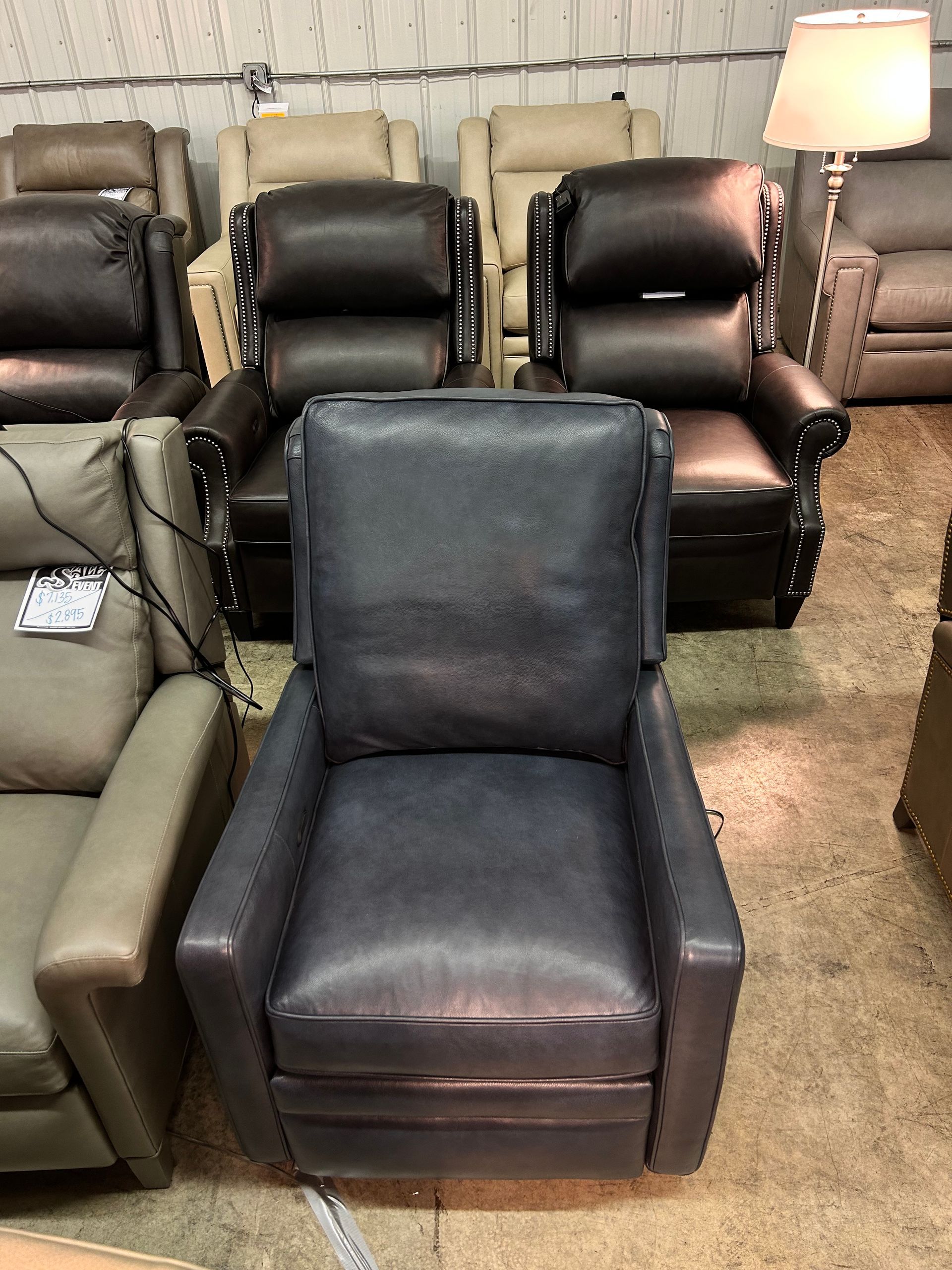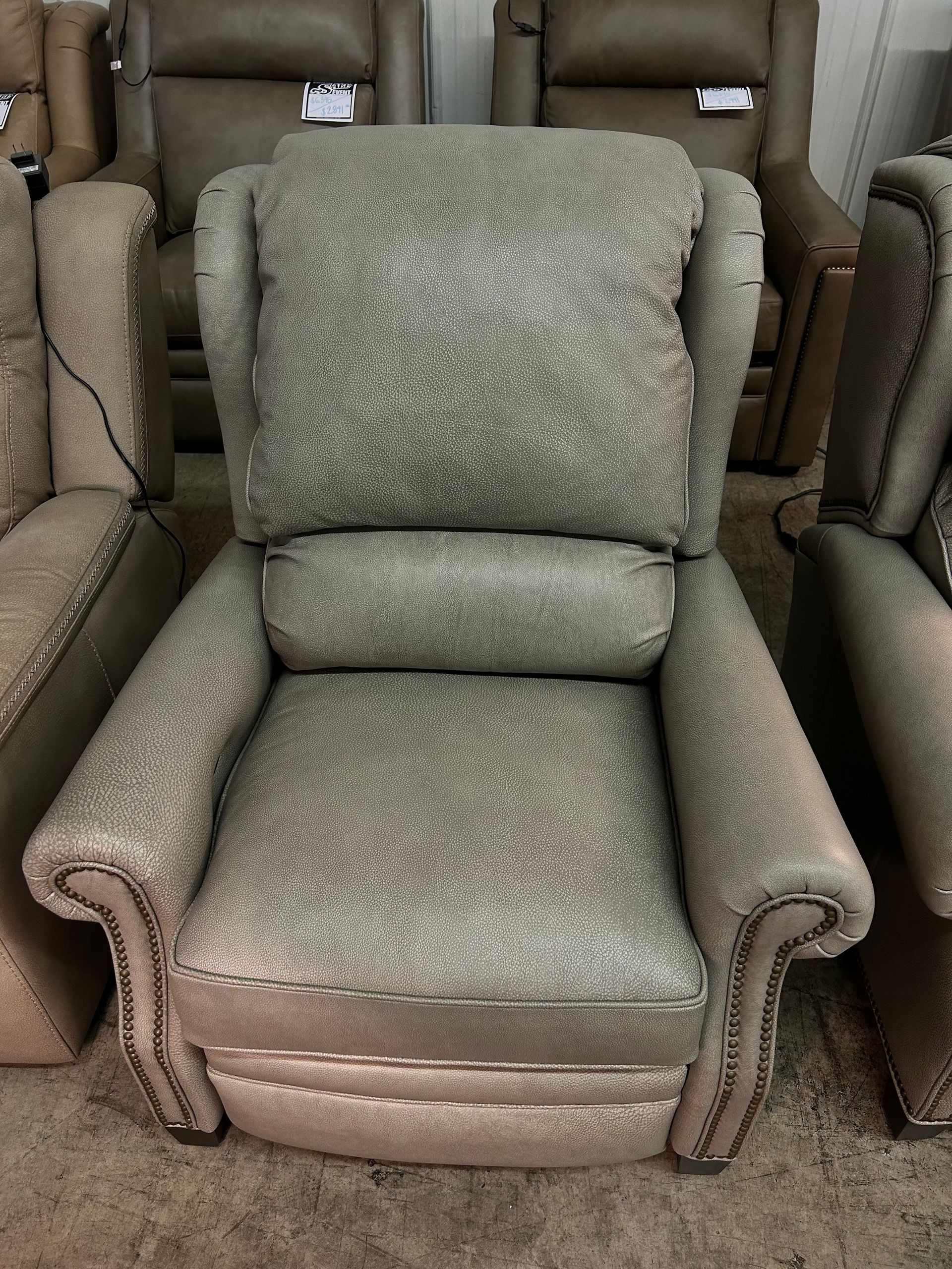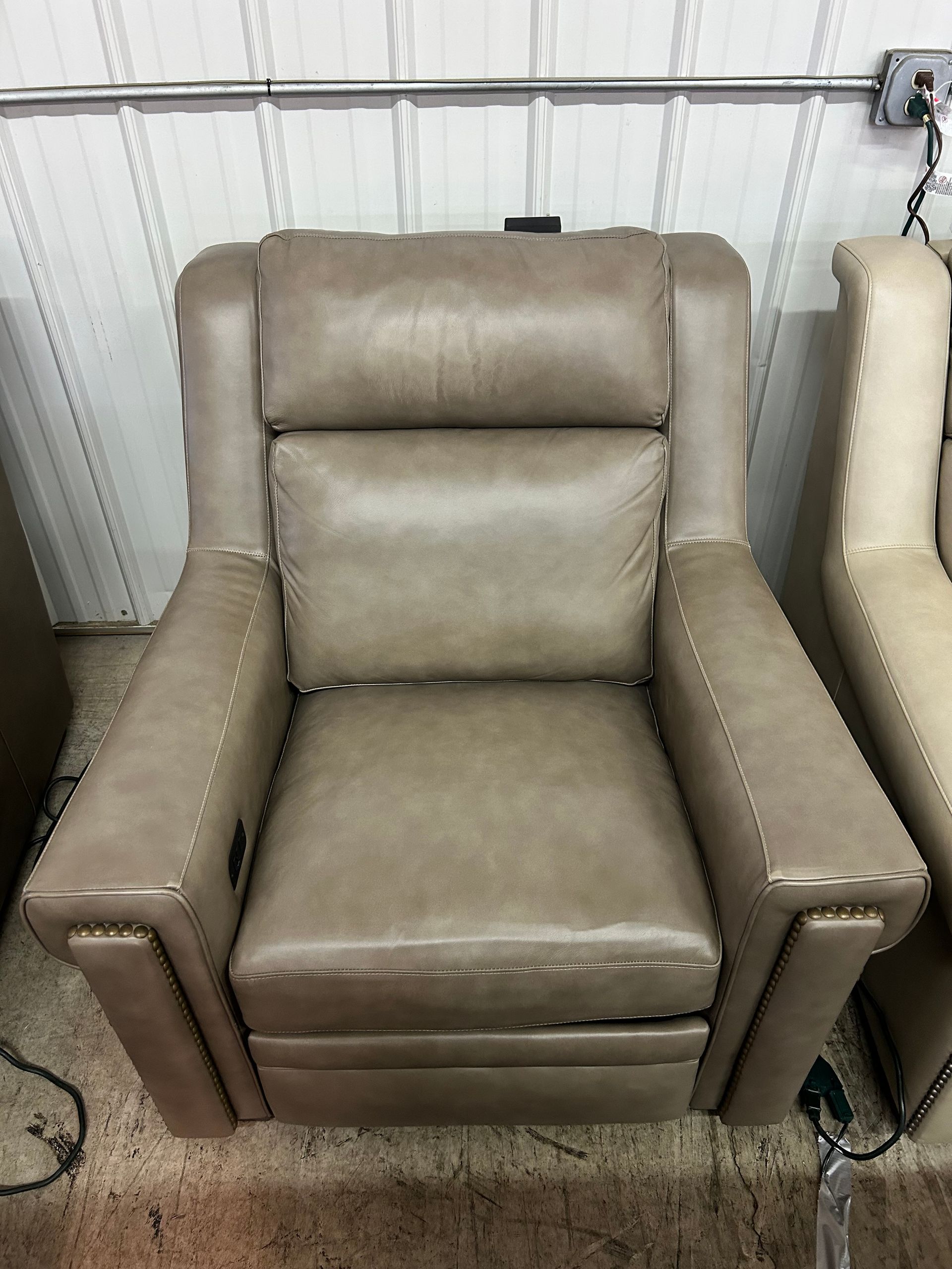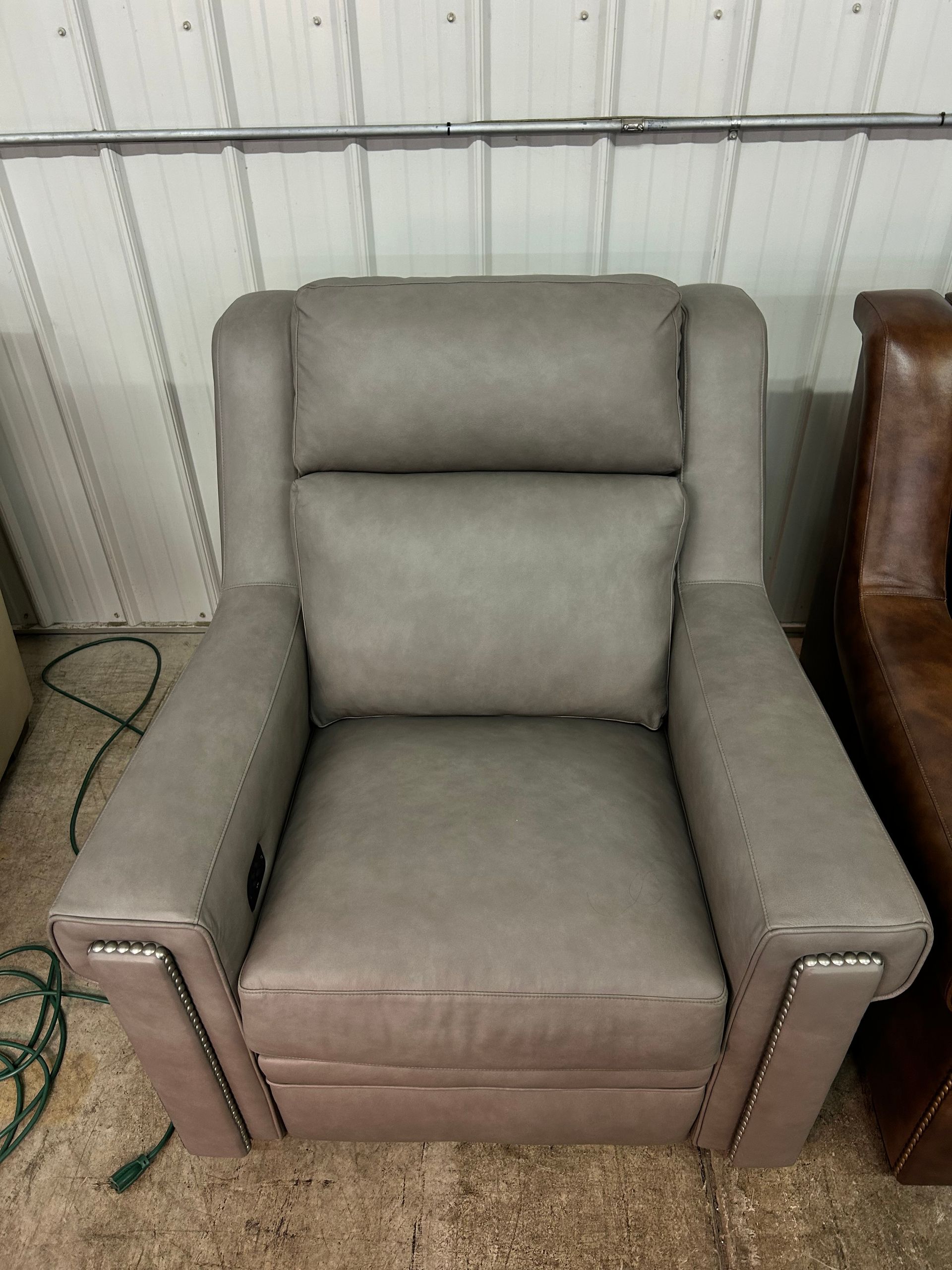 Grey leather power recliner with nailheads
