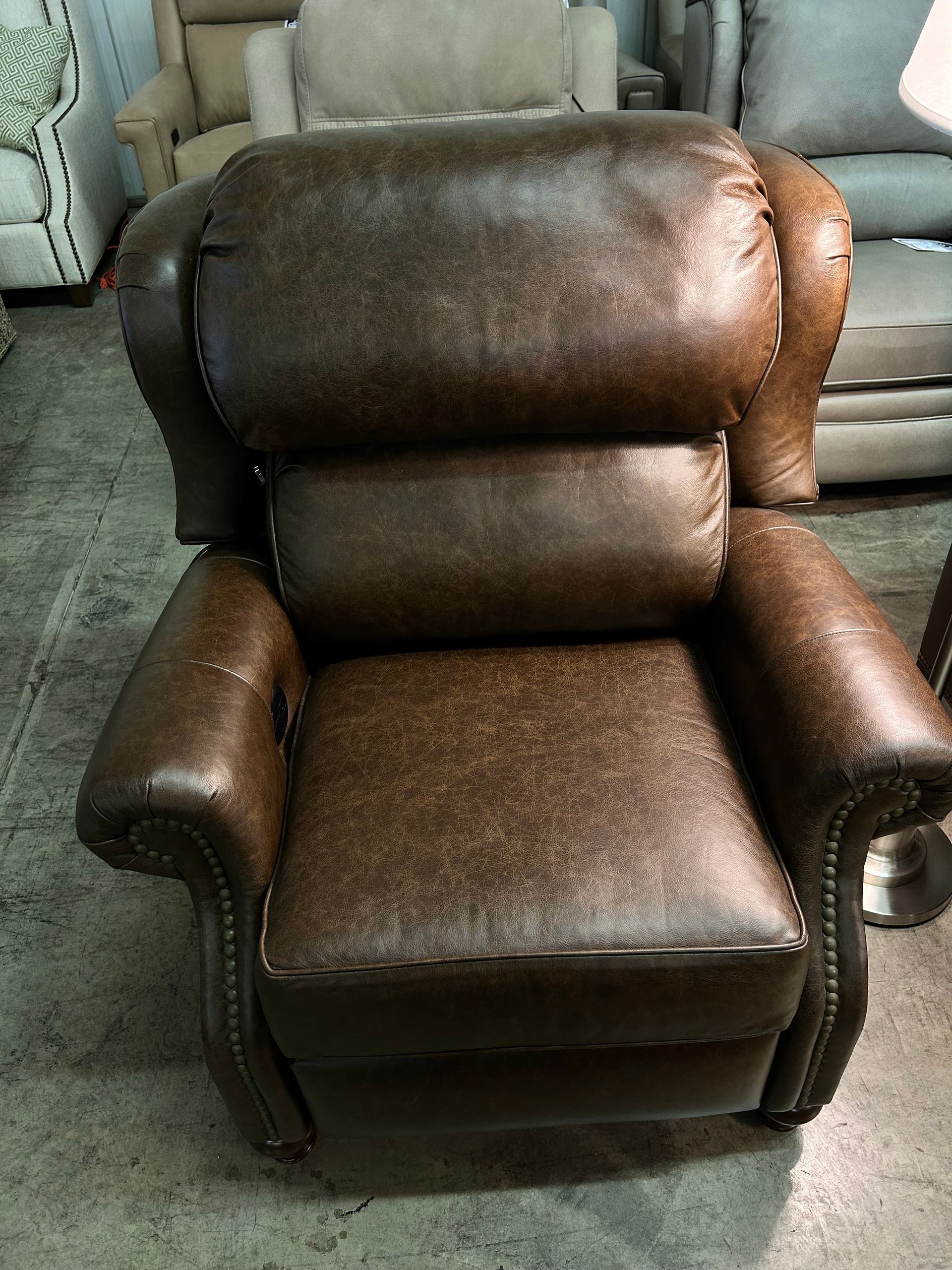 Dark brown leather power recliner with nailheads