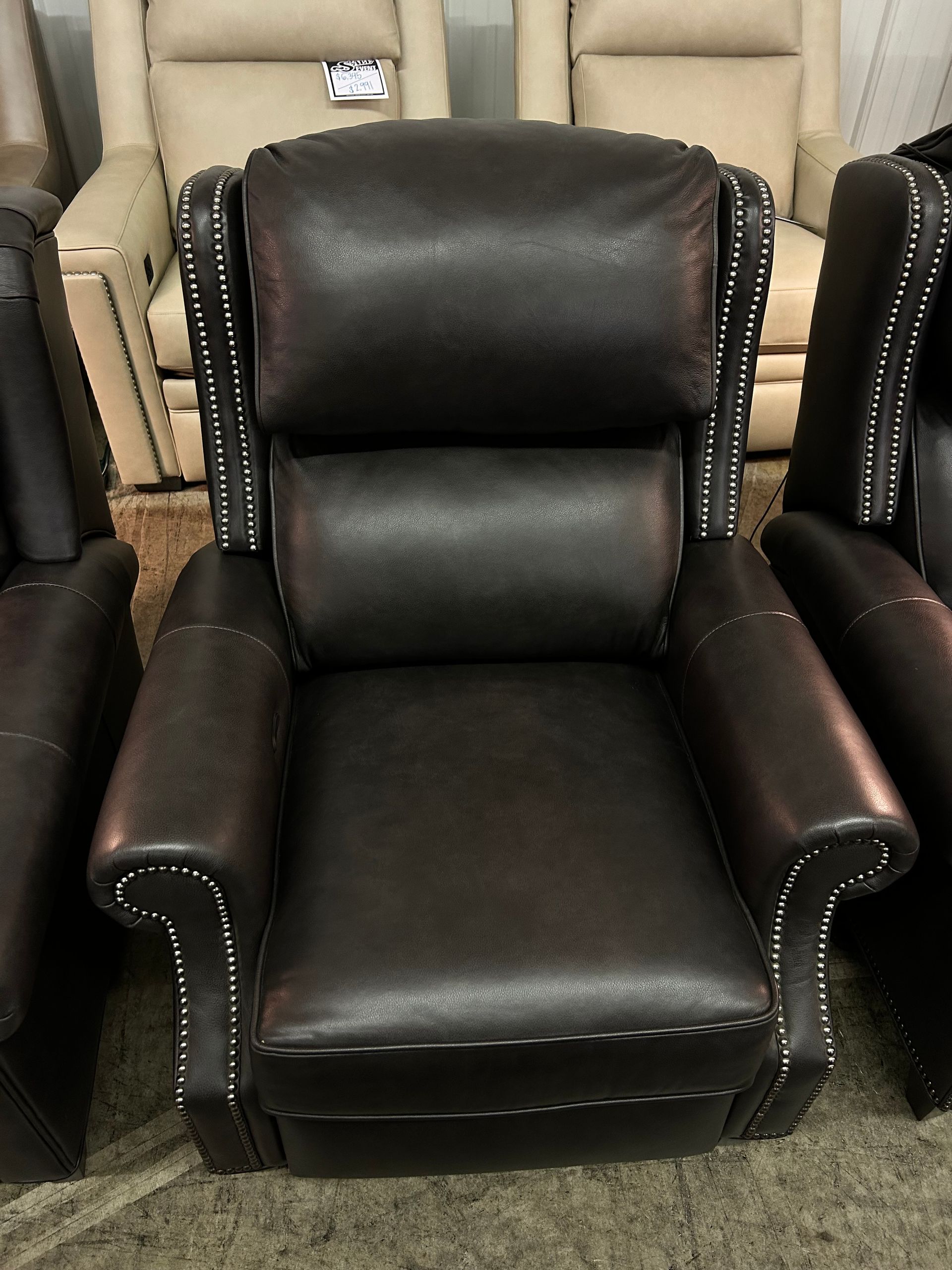 Dark brown leather pushback recliner with nailheads