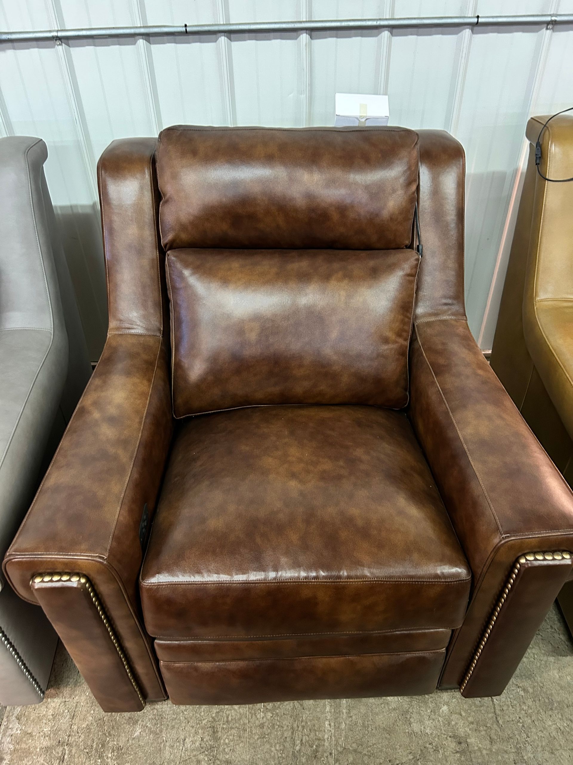 Brown leather Imagine power recliner with articulating headrest and nailheads