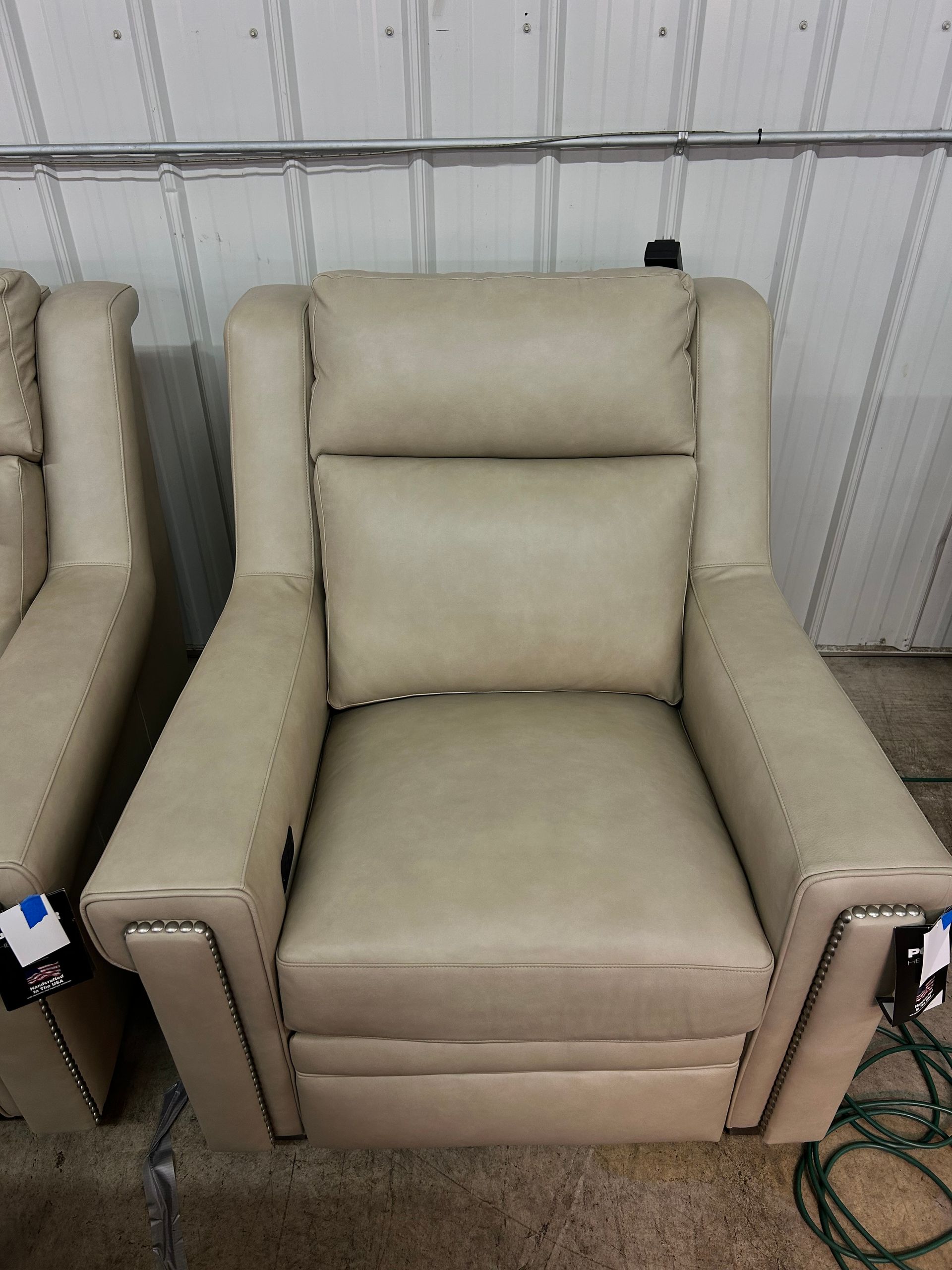 Light taupe leather Imagine power recliner with articulating headrest and nailheads