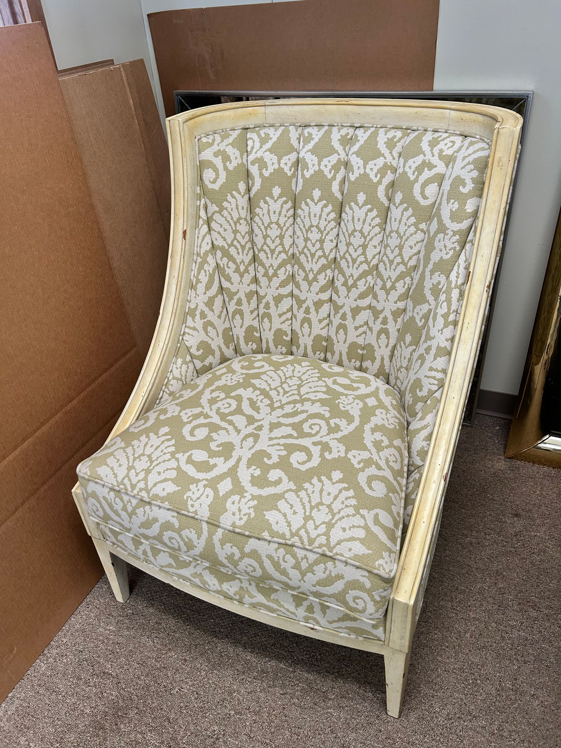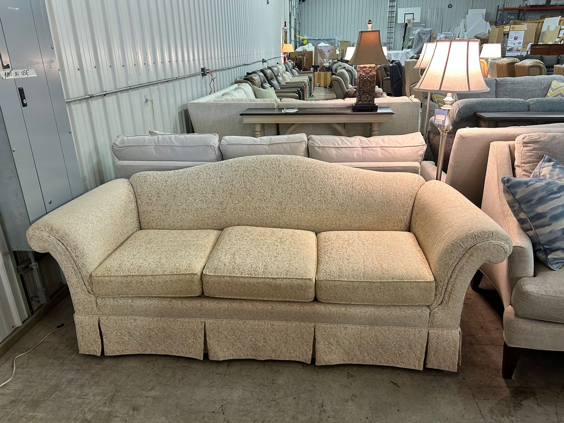 Cream damask upholstered 3 cushion tightback camelback sofa
