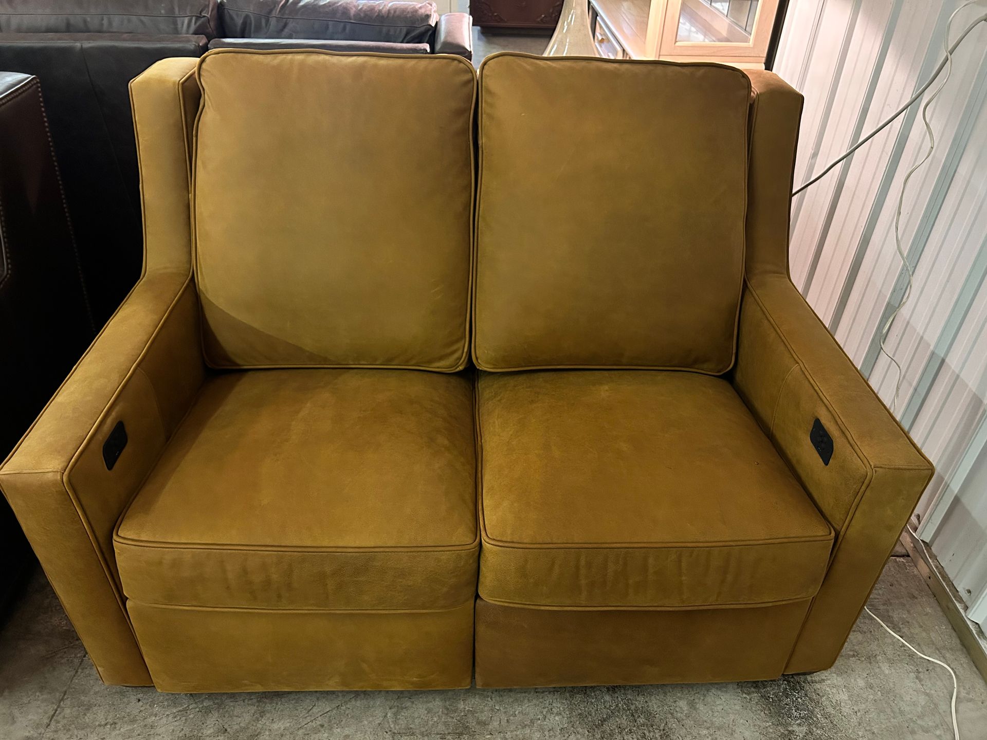 Brown/Gold nubuck leather power loveseat with articulating headrest