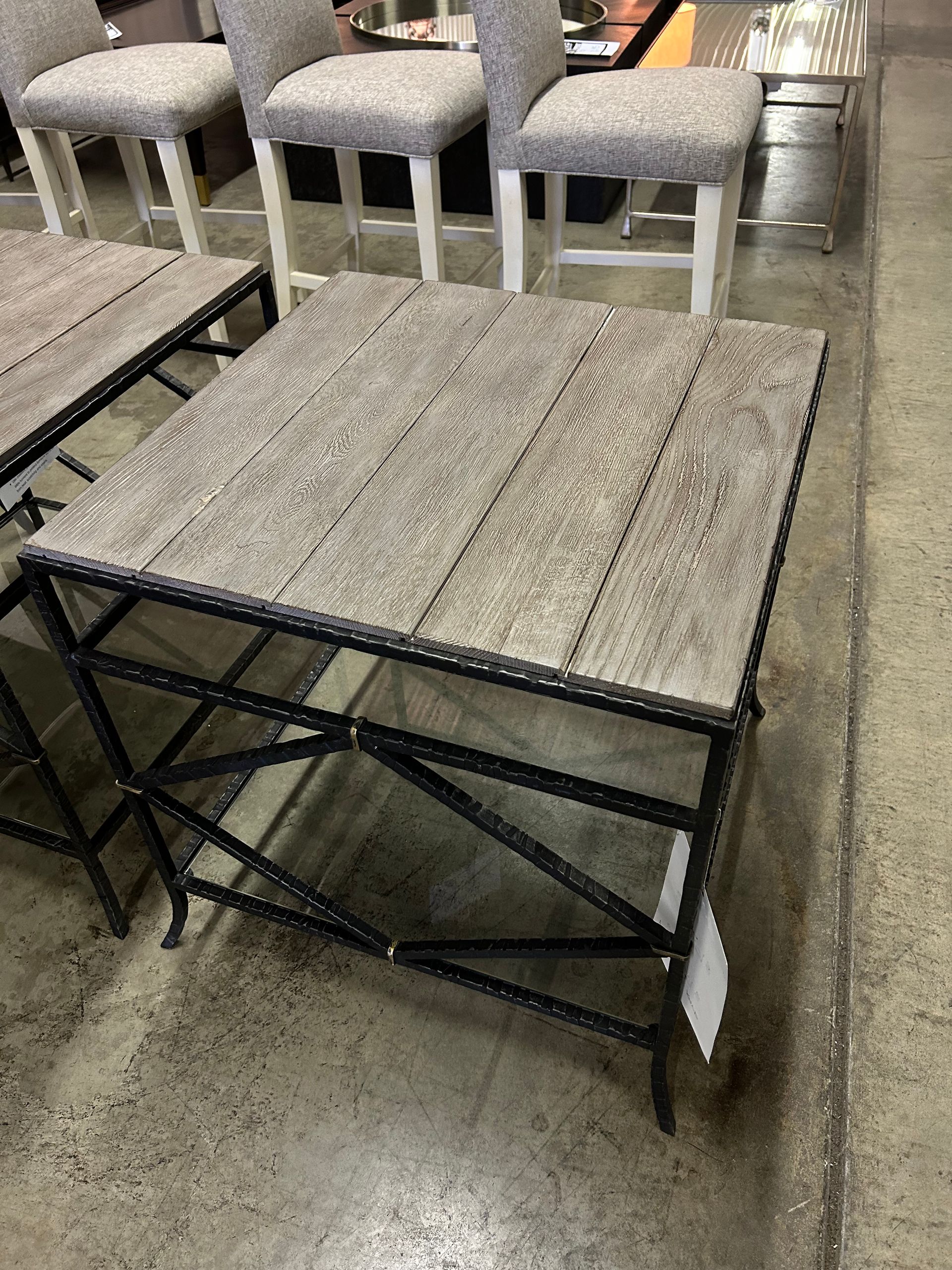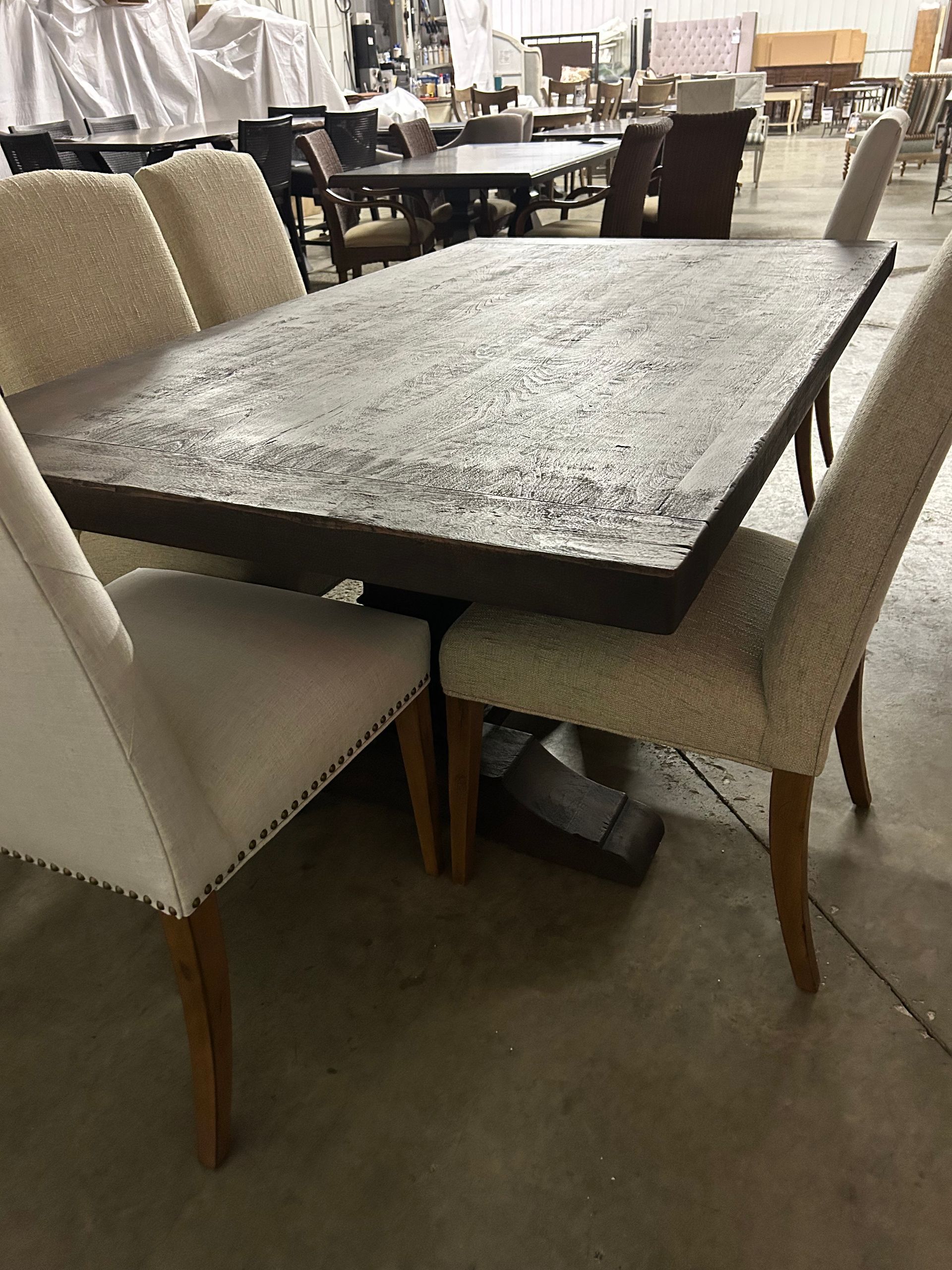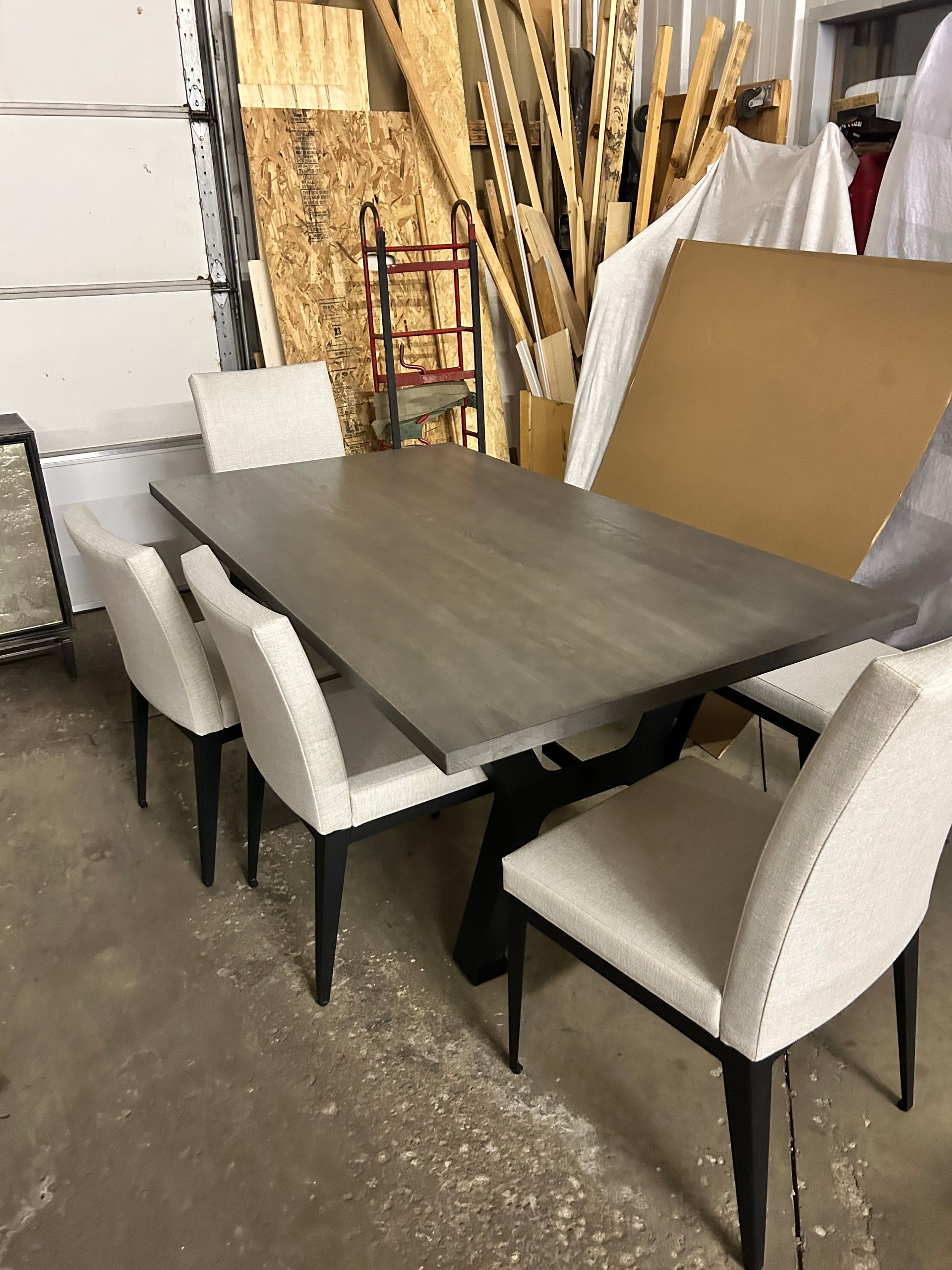 Grey wood dining table with iron base, 2 host chairs, 2 side chairs and a bench