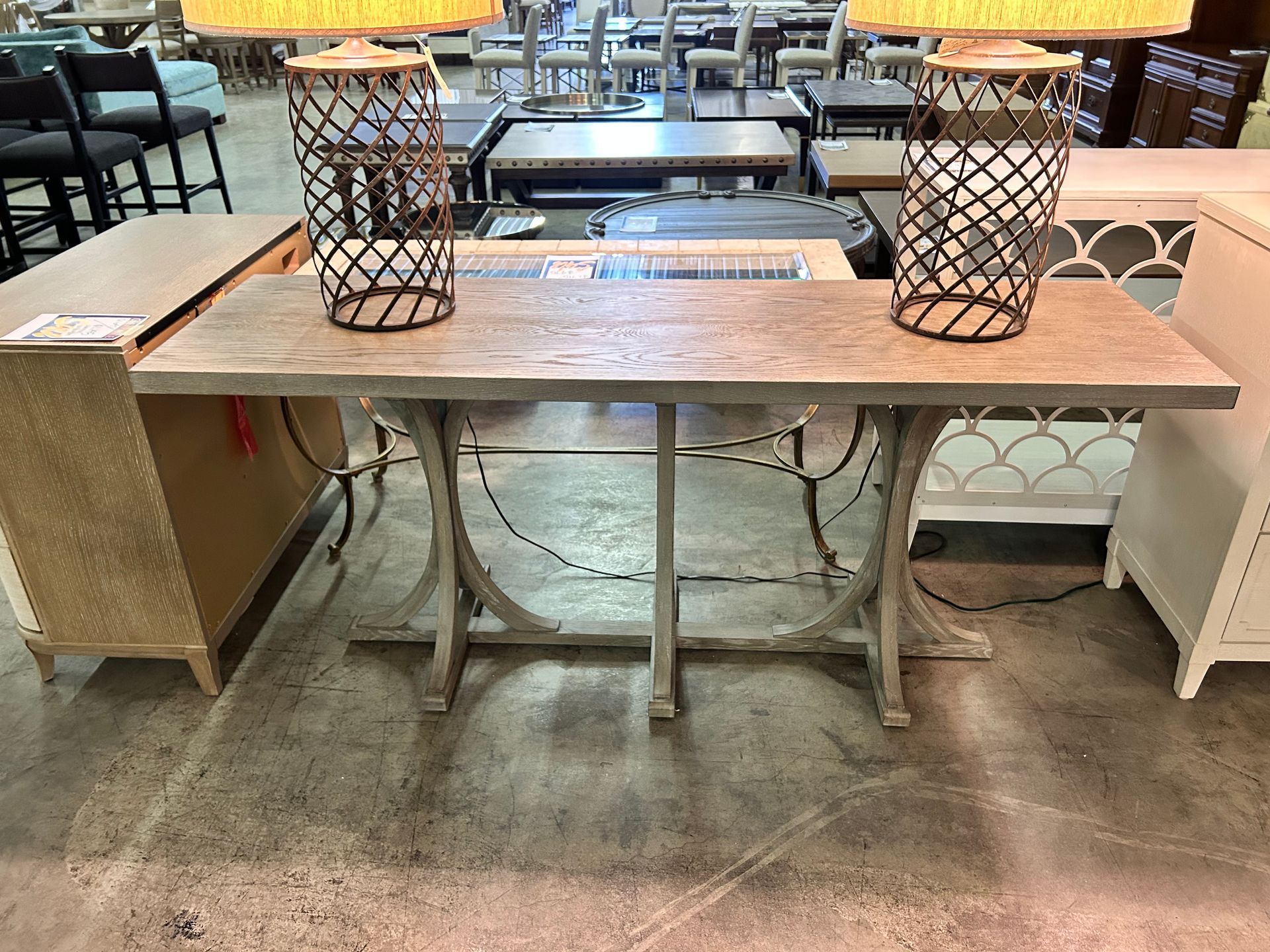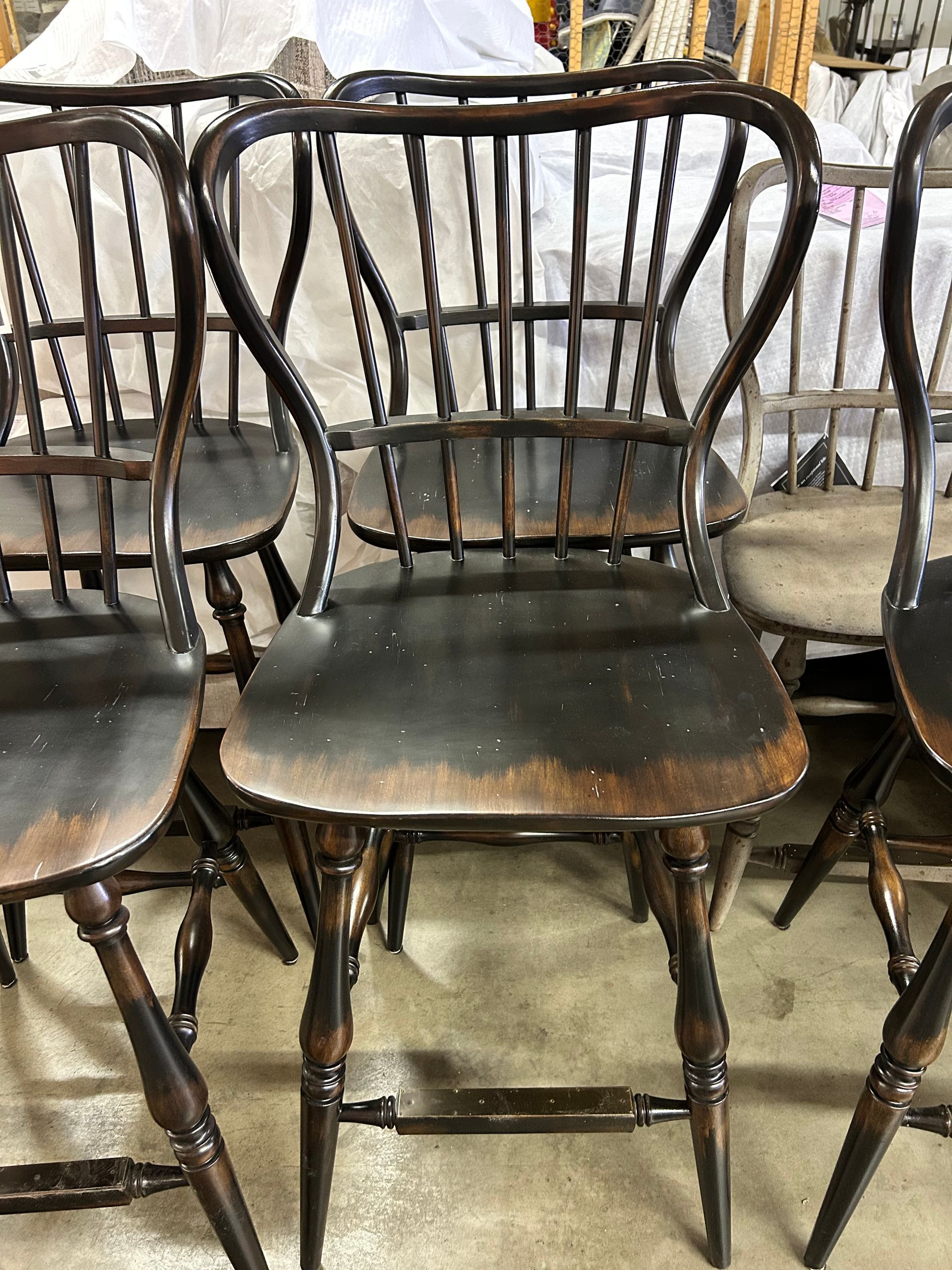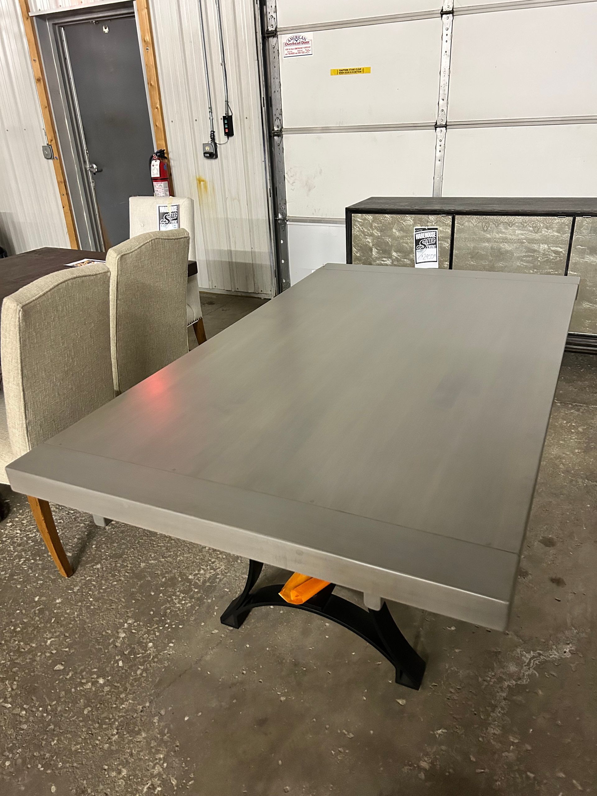 Grey wood dining table with iron base, 2 host chairs, 2 side chairs and a bench