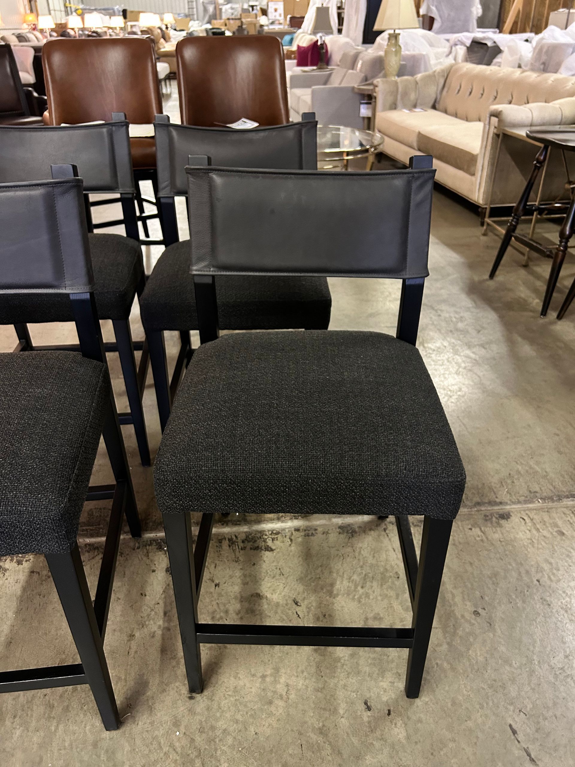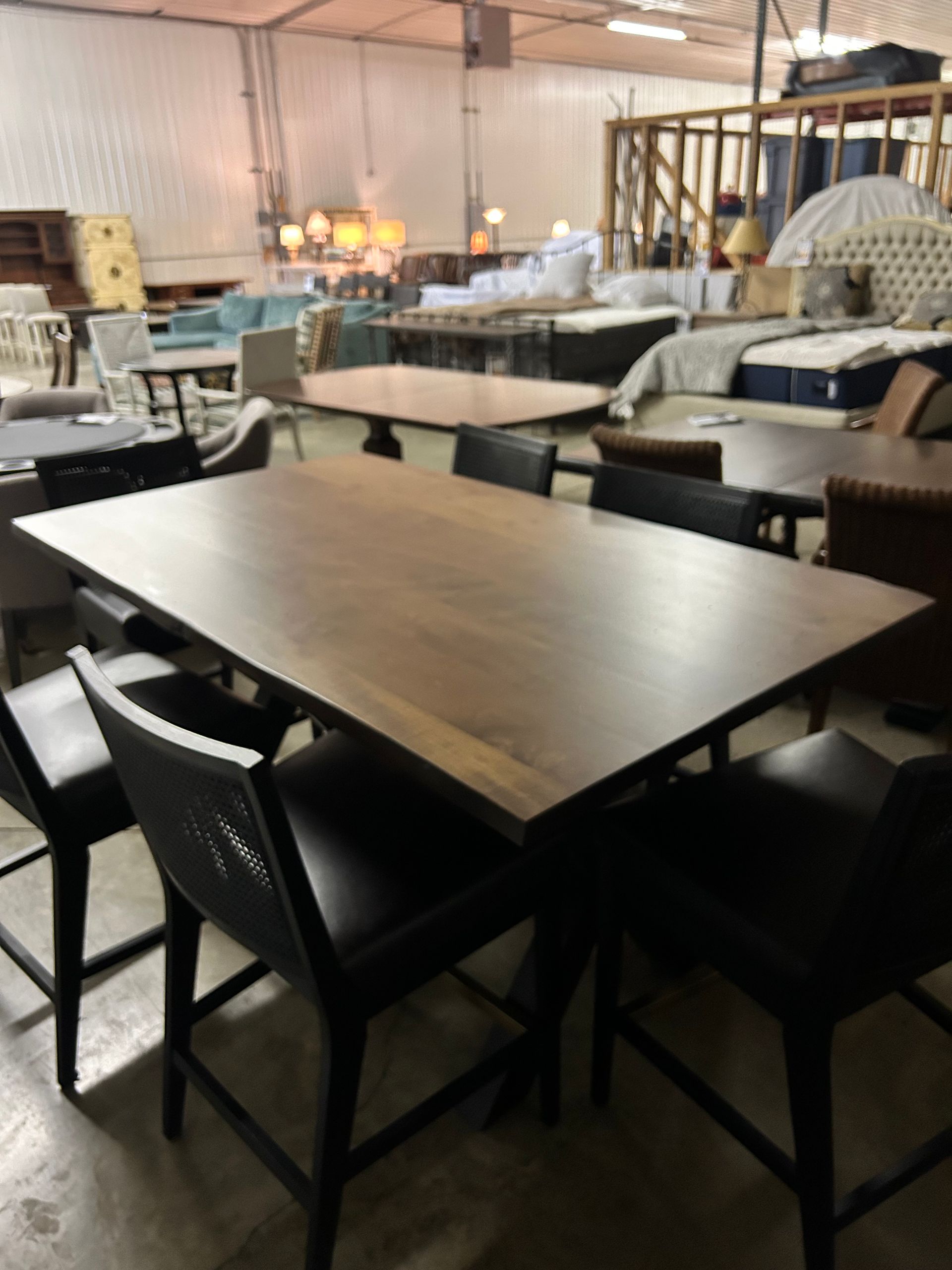 Counter height live edge trestle table with 6 black leather counter stools from Four Hands