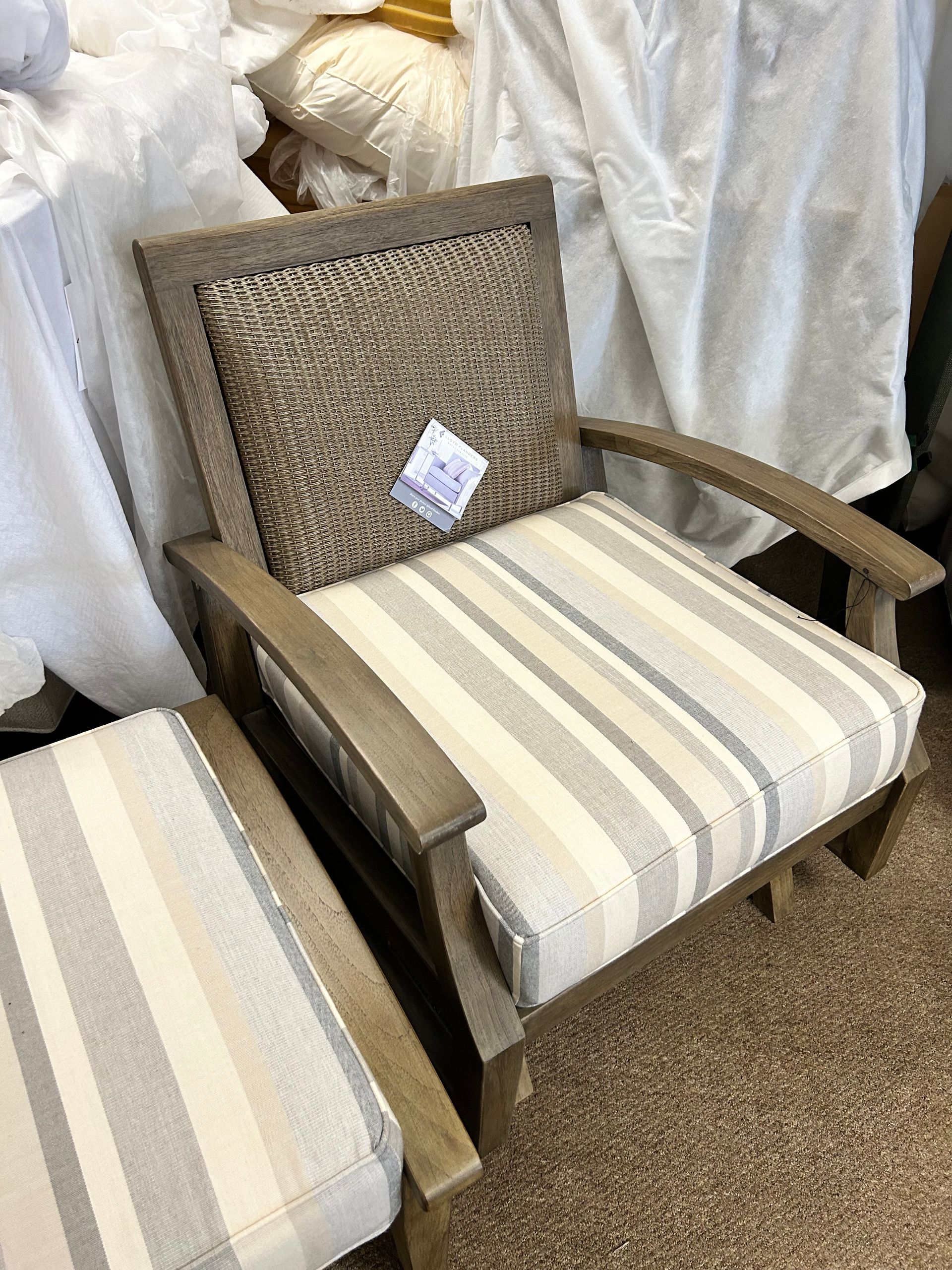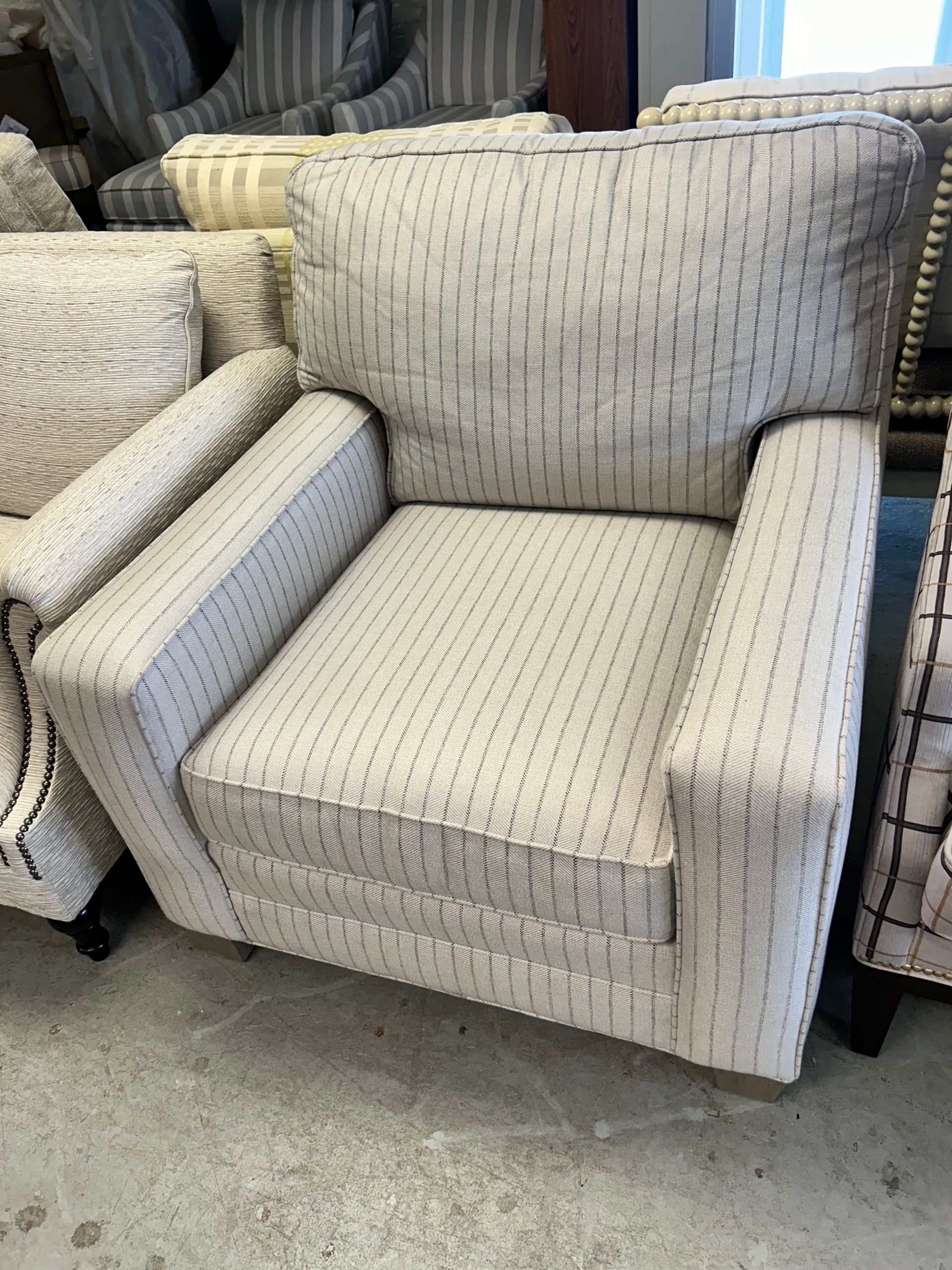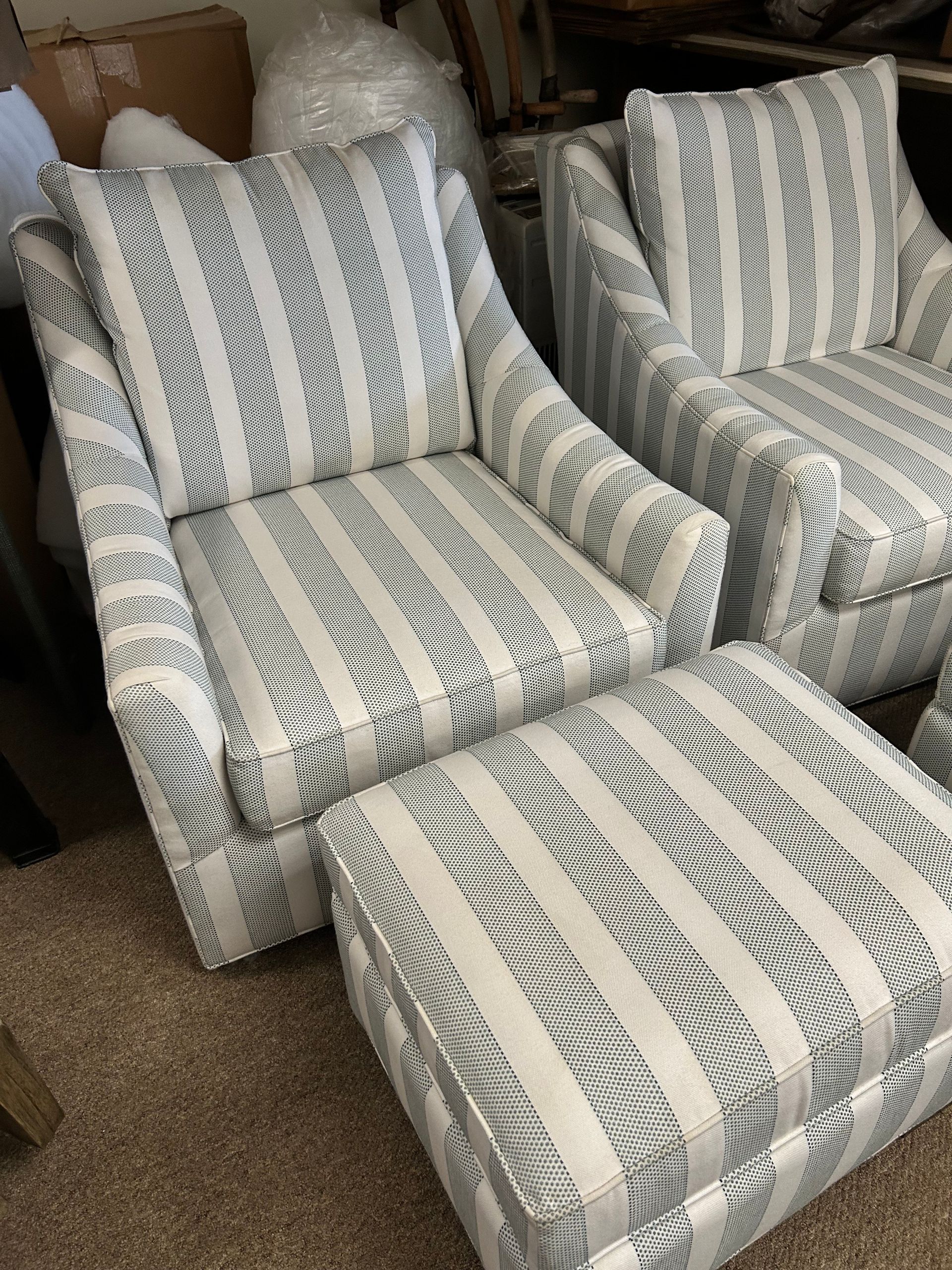 Blue and white striped upholstered chair and ottoman set