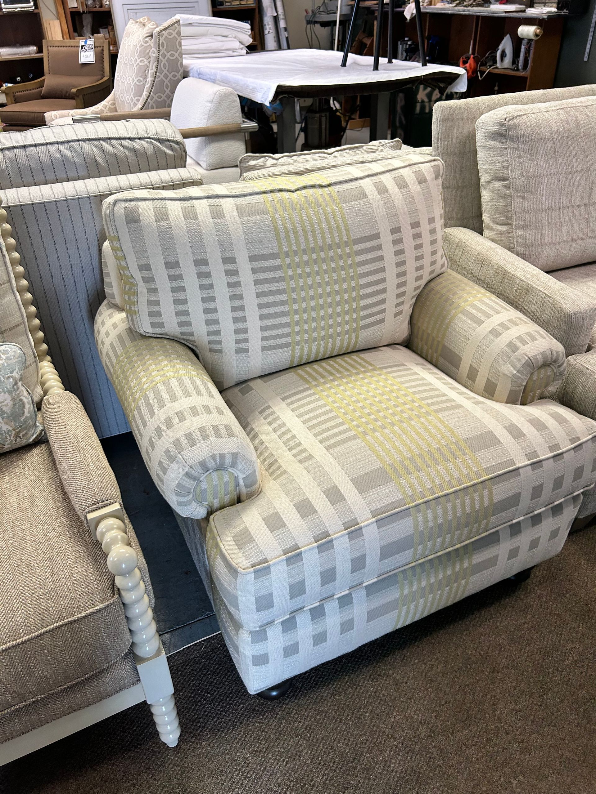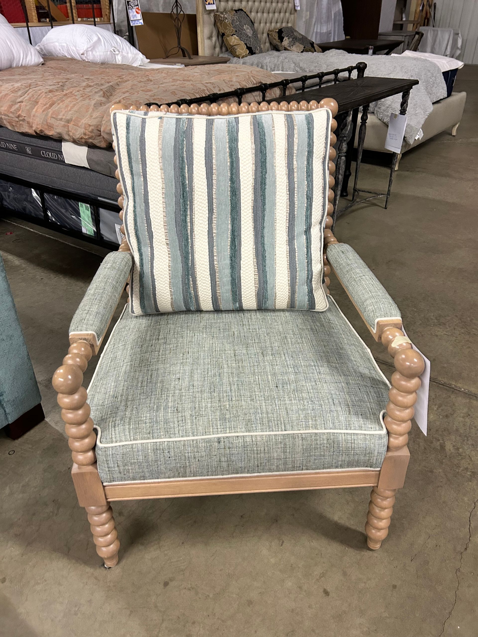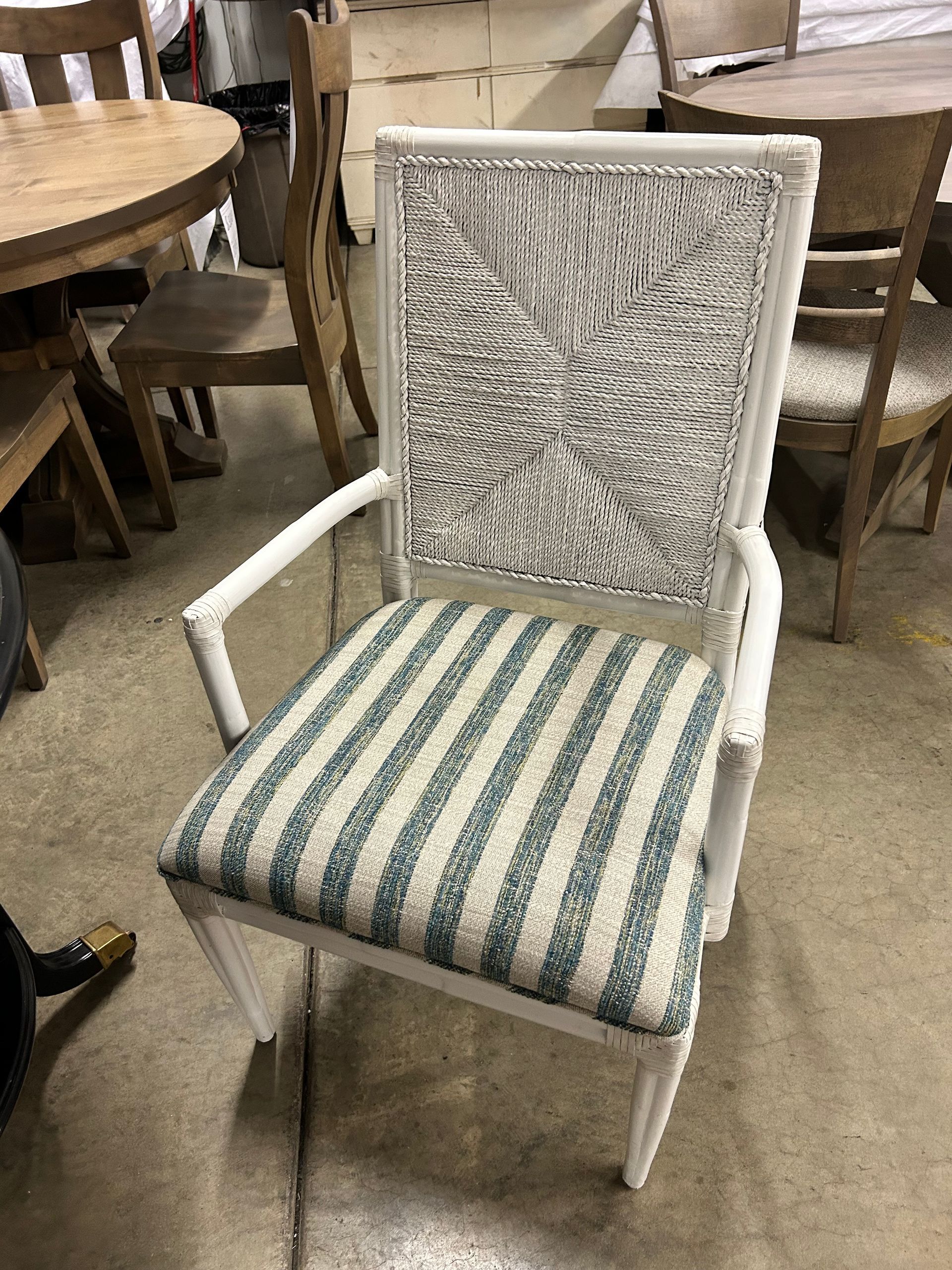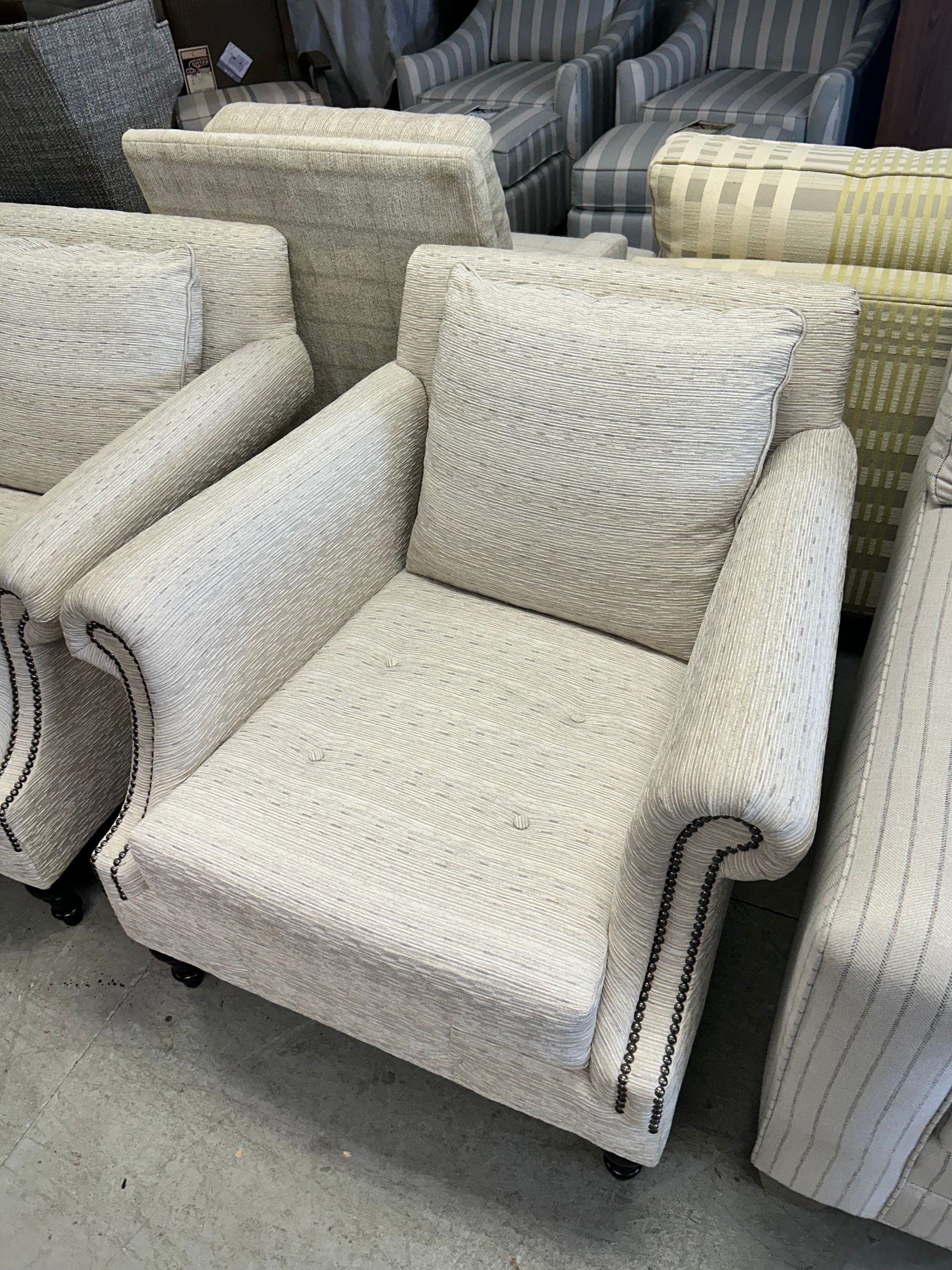 Blue and white striped upholstered chair and ottoman set