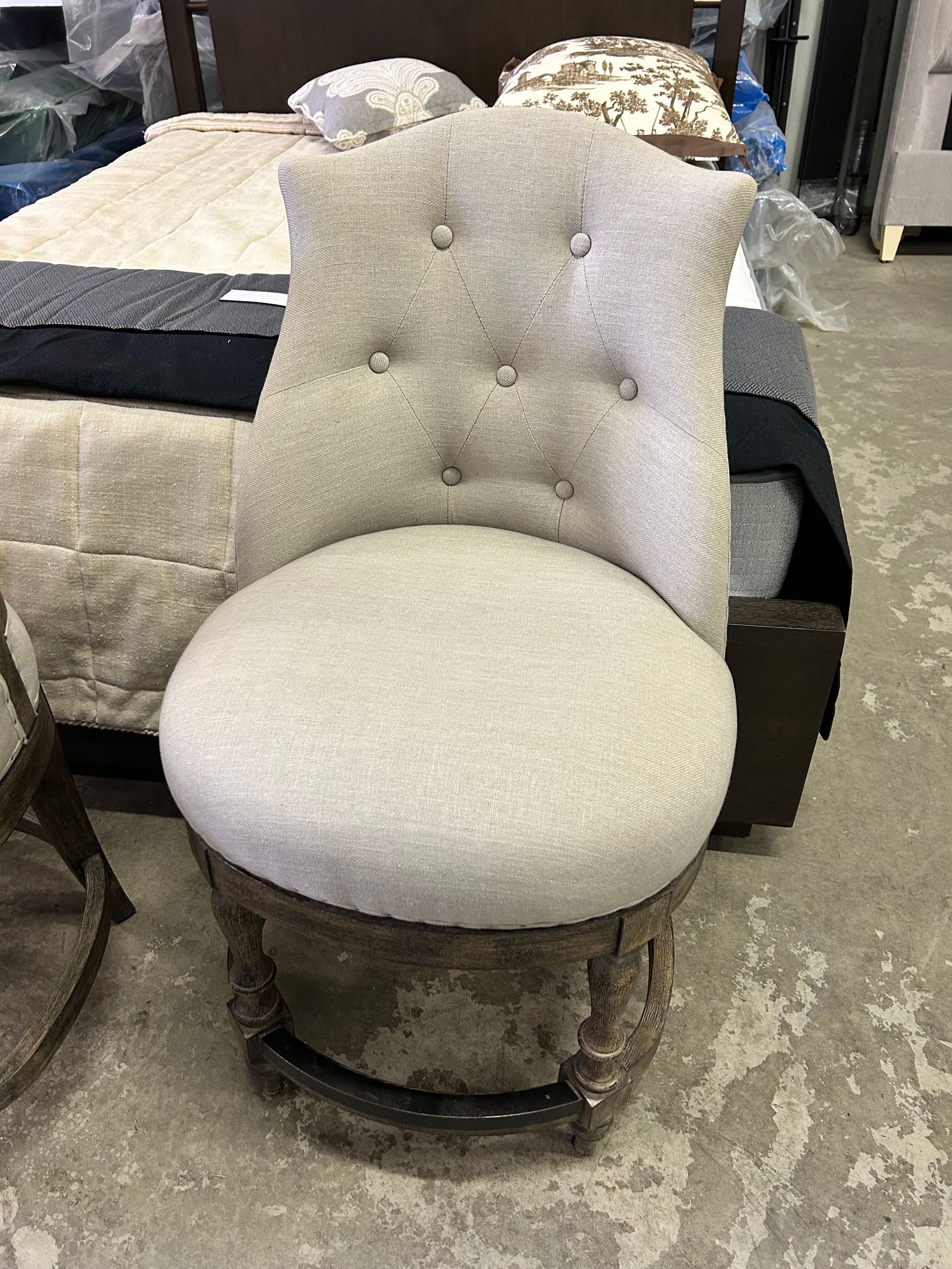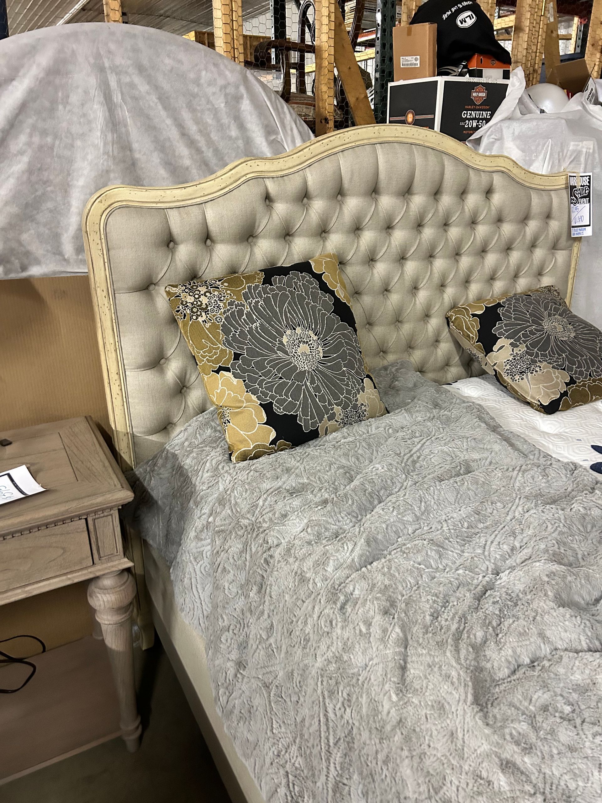 Grey upholstered tufted queen bed frame with cream wood trim