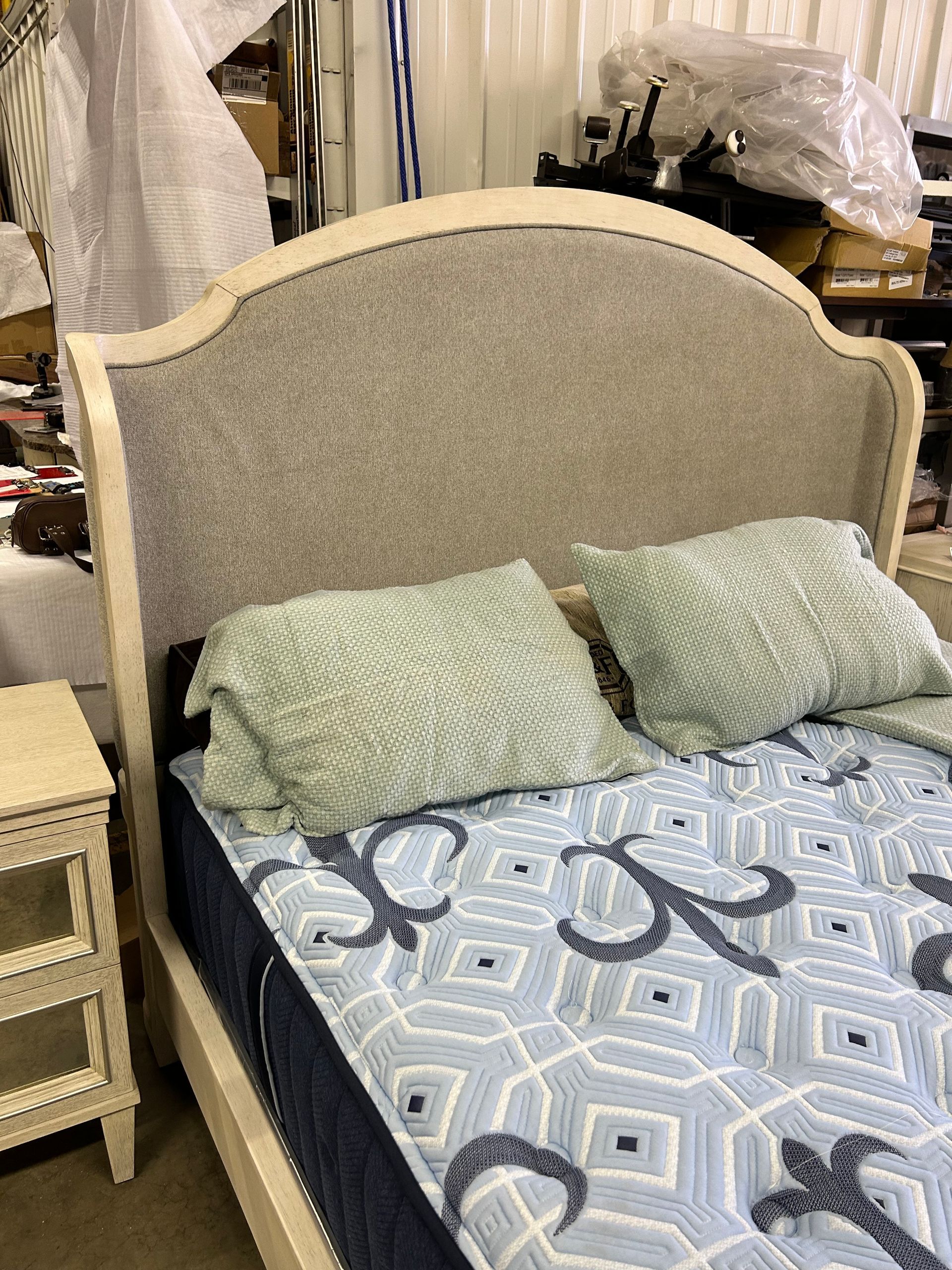 Grey upholstered winged king bed frame with cream wood trim