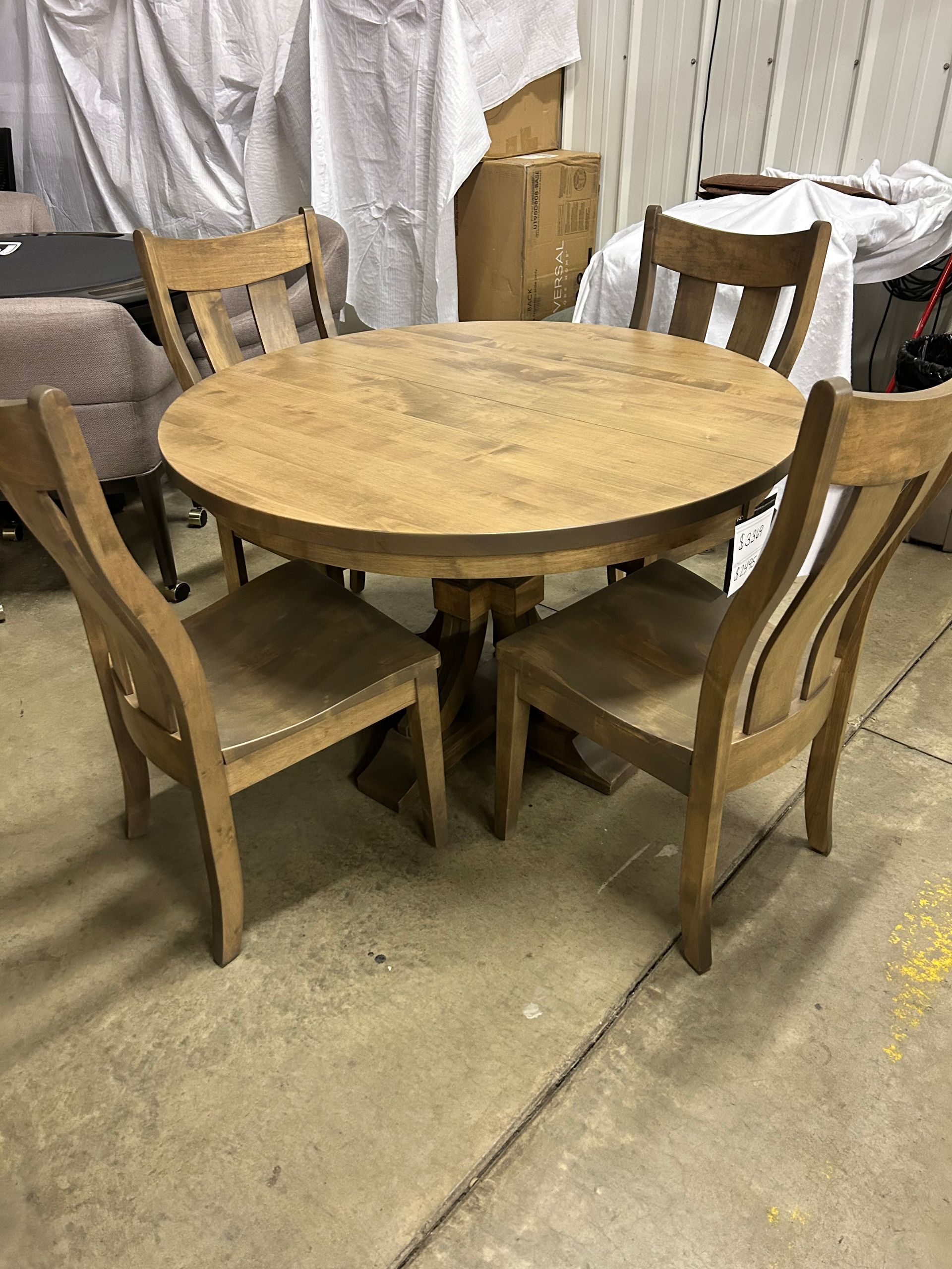 48 inch round solid wood, single pedestal dining table with wood side chairs