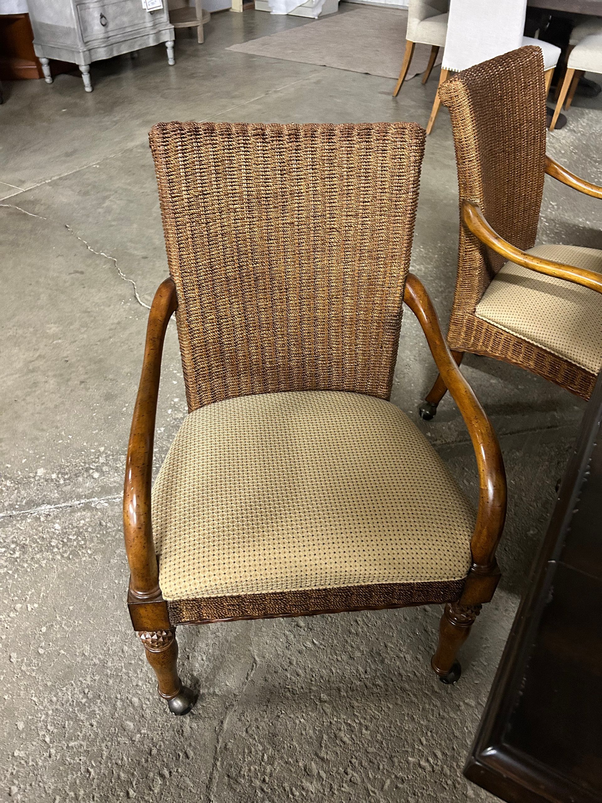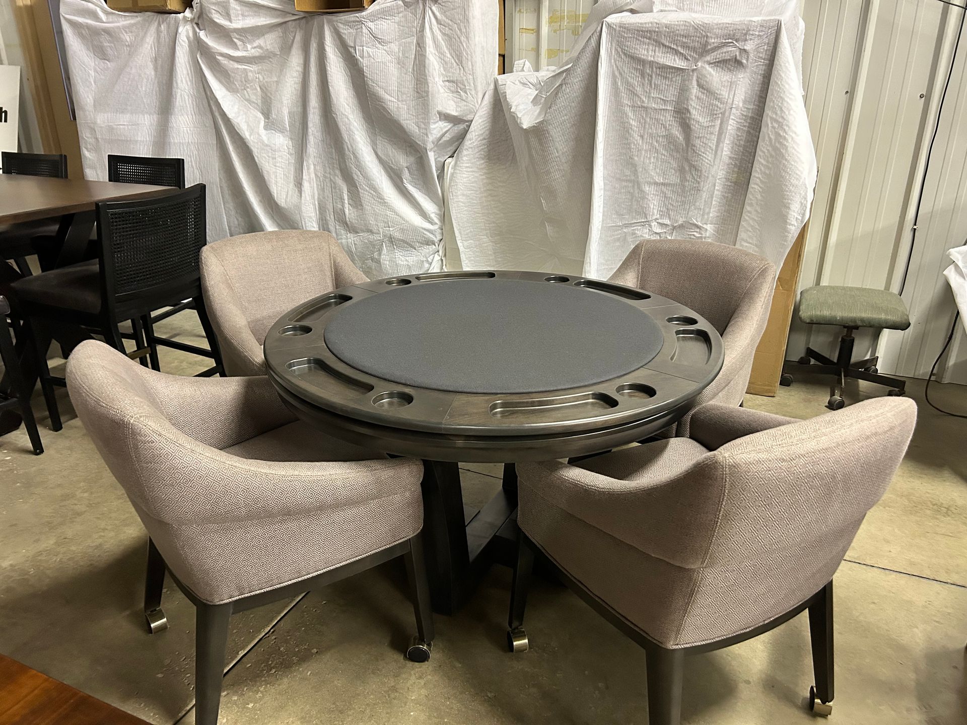 Round game table with 4 rolling upholstered chairs